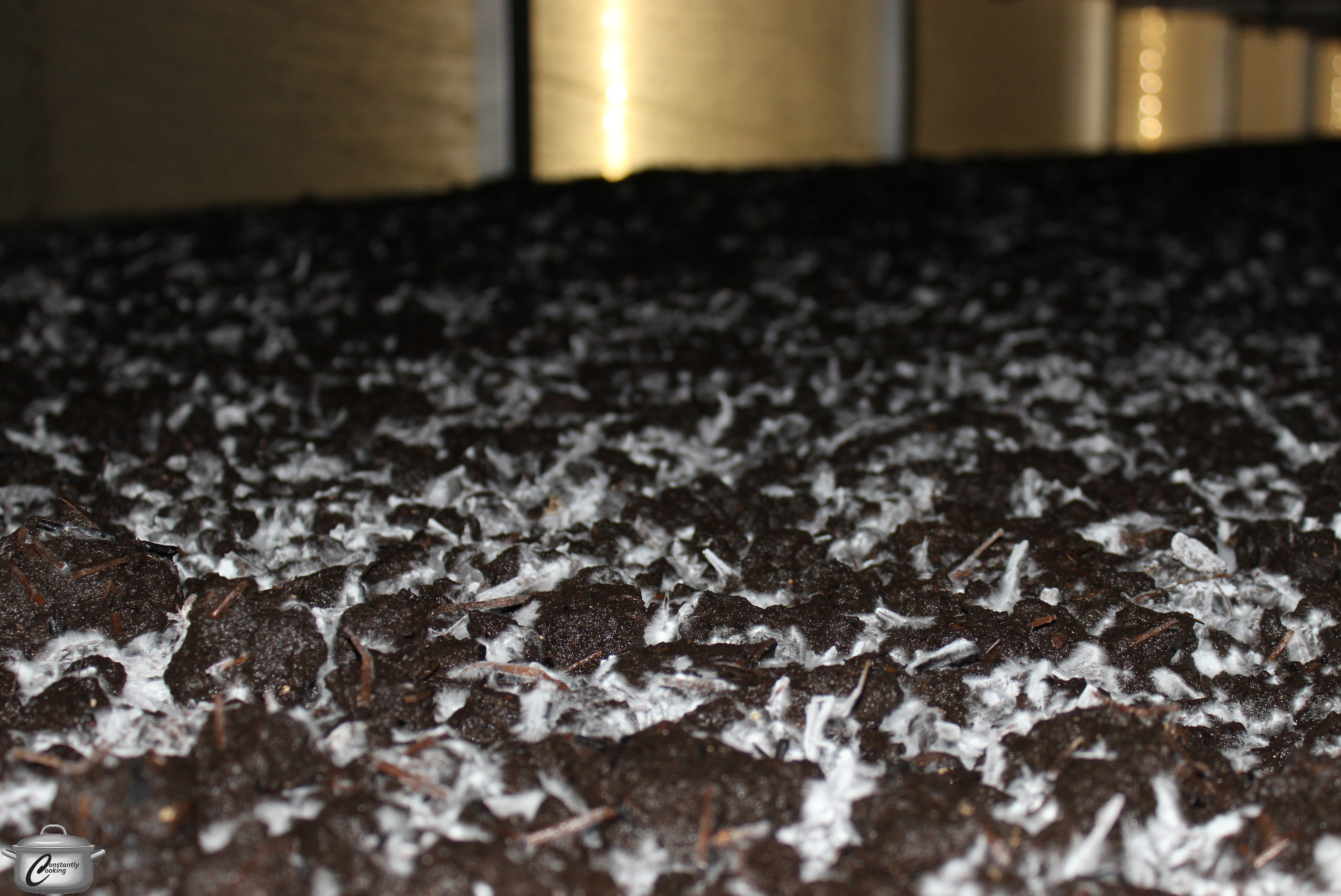 The growing process begins with mycelium (actively growing mushroom culture) being propagated in a lab on sterilized grains of millet or rye; these inoculated grains are referred to as spawn and Carleton buys its spawn from a central supplier. The spawn is planted in the nutrient-rich, compost-based substrate. White strands appear on the surface of the substrate after about 5 days; this is the mycelium, the living fungus that produces the mushrooms. By about day 11 the mushrooms are visible; they are called ‘pins’ at this first stage of growth and from this point on, they double in size every 24 hours! Picking starts at about day 30 and continues for two weeks.