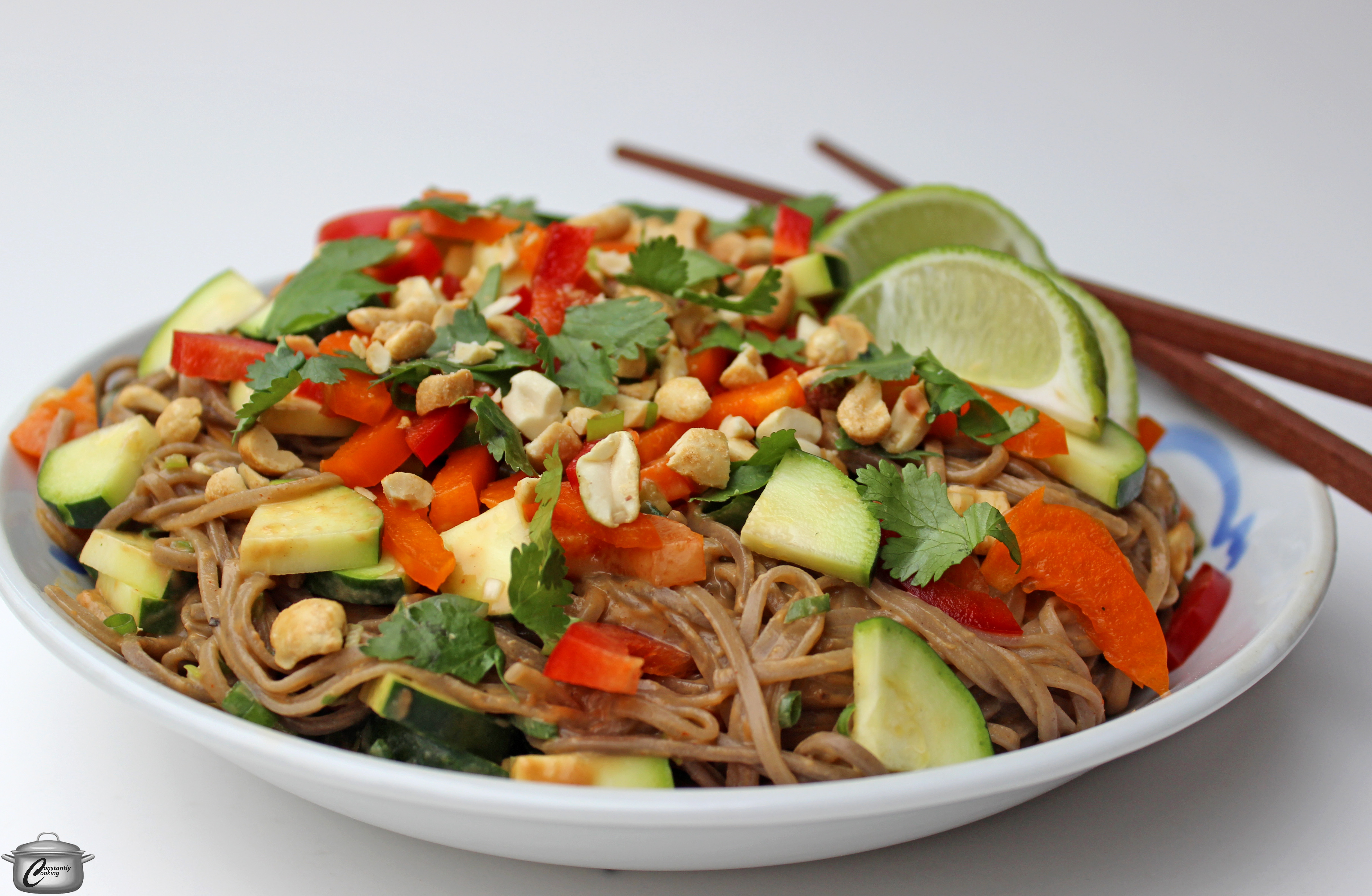 A few times each week, I try to make a dish that can do double-duty as dinner one night and lunch the next. This is my new favourite “intentional leftovers” meal. It is so quick to prepare and I just love the combination of the tangy peanut sauce and crisp, raw vegetables. Soba noodles are a staple in Chinese cuisine; today most of them are made from a combination of white and buckwheat flour but at specialty food stores you should be able to find all-buckwheat noodles, which are gluten-free, if that’s important to you or your guests. You can also substitute with your favourite wheat, corn or rice pasta but you’ll need to adjust the cooking time for the noodles accordingly. Adding in thin slices of cooked chicken would also be delicious for a non-vegan version of this dish.