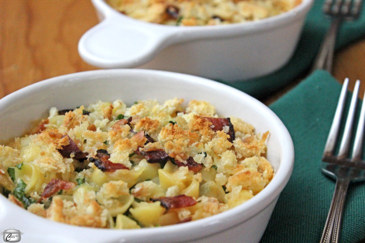 My family has always loved homemade mac ‘n cheese and it’s no wonder. After all, isn’t it just like a warm, creamy, comforting, satisfying hug in a bowl? I tend to always use the same basic recipe I developed years ago and then experiment with lots of different additions; this week’s new combination really hit it out of the park. In the right proportions, the simmered, tender kale adds a nice pop of colour and flavour, without overwhelming the dish. And bacon – why not? I like to prepare this in single-serving casserole dishes which is a great way to ensure everyone gets their fair share of bacon; individual portions are also ideal as a make-ahead option for busy families with staggered mealtimes.