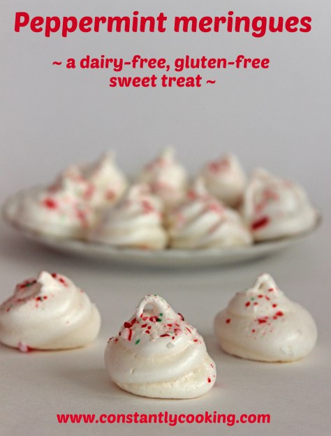 Little meringues are the perfect sweet treat to have on hand, especially during the holiday season. They store well for weeks if placed in an airtight container, and their delicate texture and flavour make them a hit with young and old. Best of all, they are gluten and dairy free so everyone can enjoy them. Each year, I make these by the tableful for eating and home and gifting to others. While you can double the recipe, I find it’s best not to beat up more than 4 egg whites at a time as the mixture will start to deflate in your warm hands while piping out the cookies onto the baking trays. Also be sure not to add the peppermint extract until the egg whites have formed stiff peaks as the natural oils in the extract will impede the whipping process.