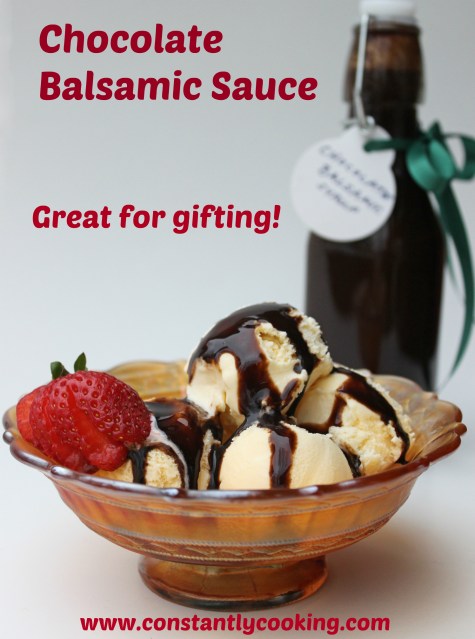 This thick, rich sauce is ideal as a glaze for roasted meats and great as a drizzle over ice cream or sliced fruit such as strawberries or pears. You can also make amazing cocktails with it by blending with vodka and soda. Note that you do not have to start with expensive, aged balsamic to make this sauce; reducing ordinary balsamic will thicken it before you combine with easy to make chocolate syrup.