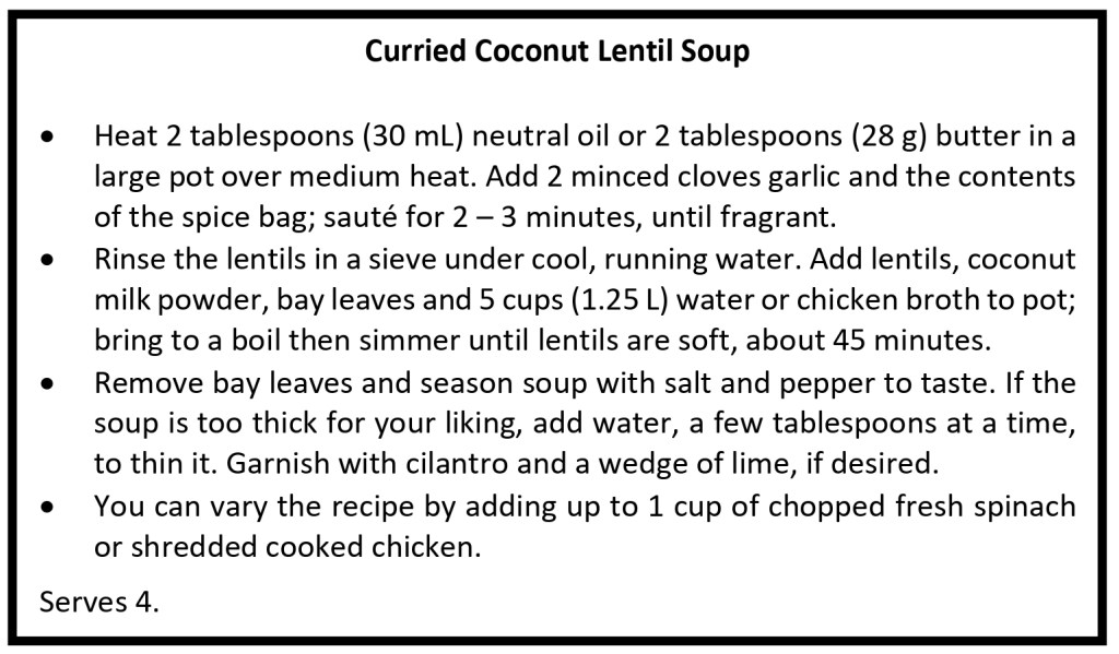 I love gifting treats from my kitchen to friends and family. Some of my favourites include roasted spiced nuts, salted caramel pretzel bark  and flavourful caramel-apple jelly. You can find loads more edible gift ideas on this blog! This year, I added something new to the repertoire: a layered dry soup mix with instructions on how to transform the jar’s contents into an aromatic, delicious pot of soup. You should be able to find all the ingredients needed to make this soup mix at your local bulk food store.