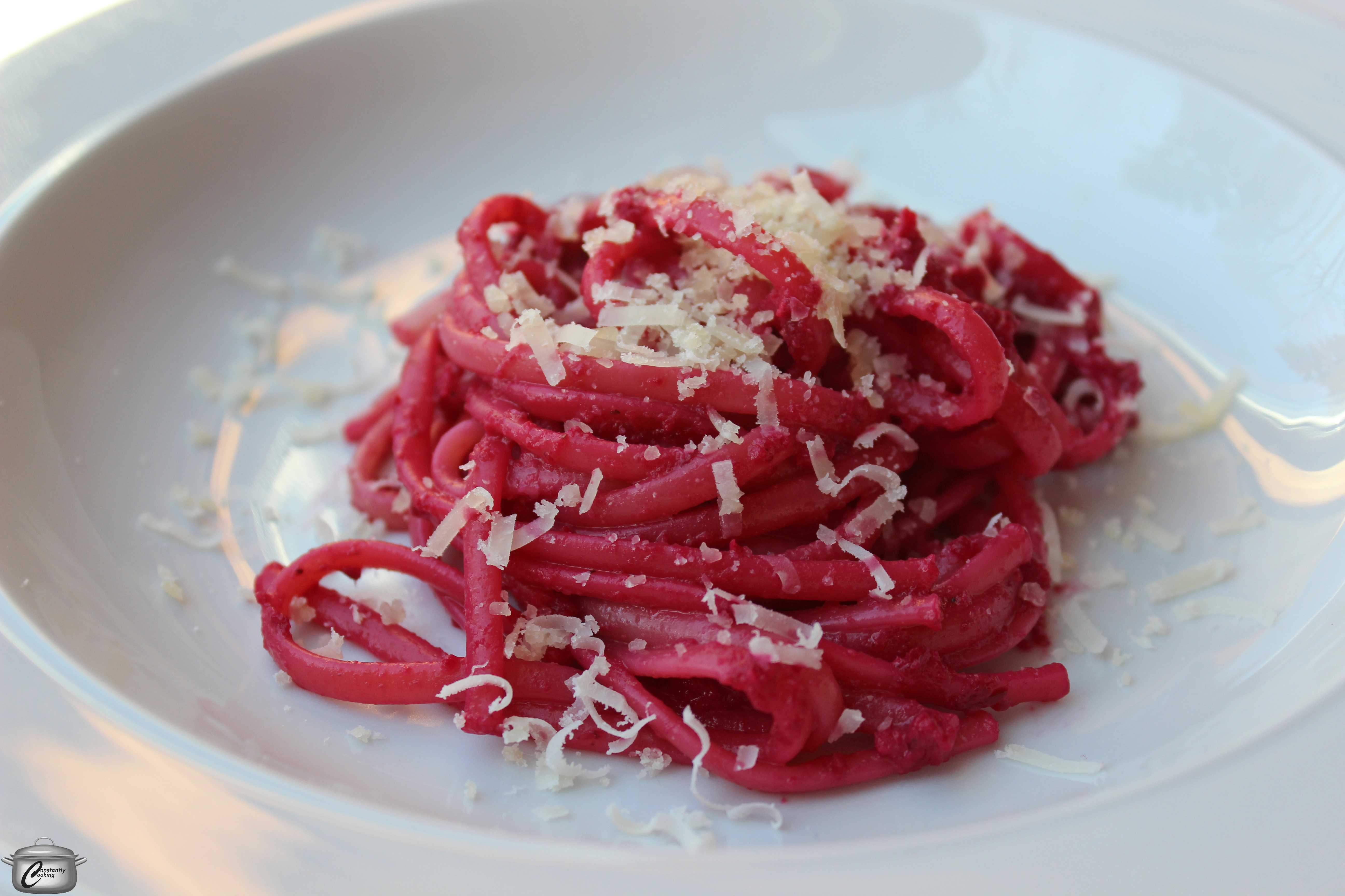 Main: Pasta with roasted beet, garlic and walnut pesto