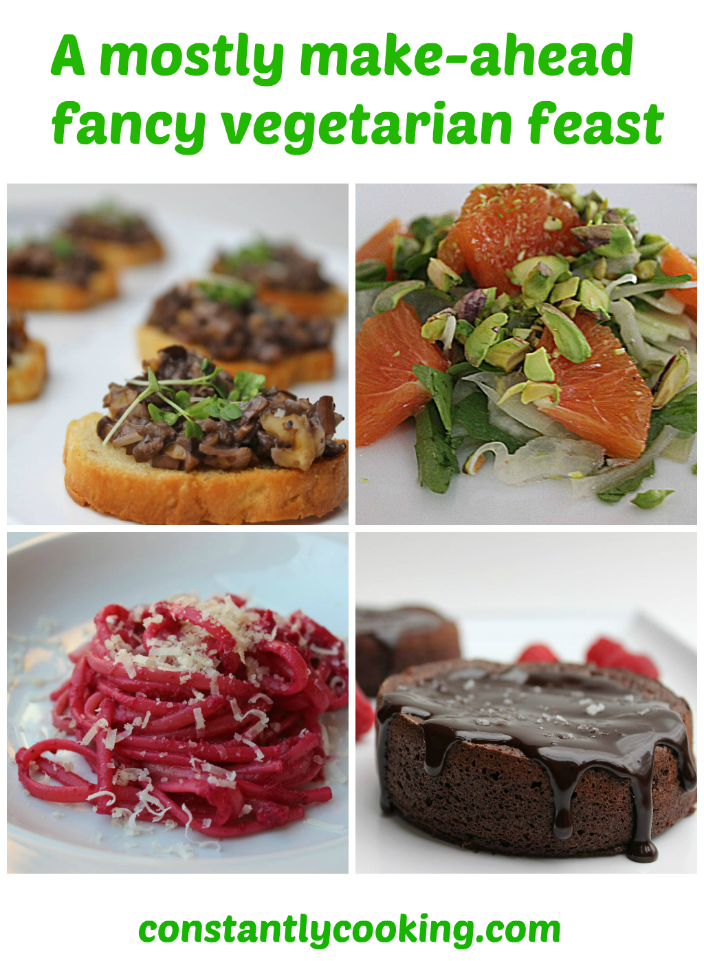 Move over, meat and potatoes. When it comes to making a special dinner at home, why not try a new approach to menu planning? Vegetarian meals by their very nature are colourful and appealing; they can be equally festive as well, like the following easy yet impressive feast. The best part is that in addition to being healthy and delicious, it’s also mostly make-ahead, so you can focus on enjoying the company of whomever you are dining with, rather than slaving in the kitchen.