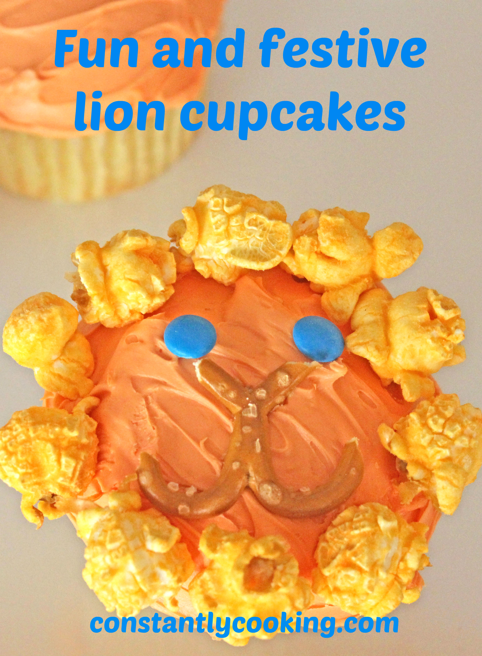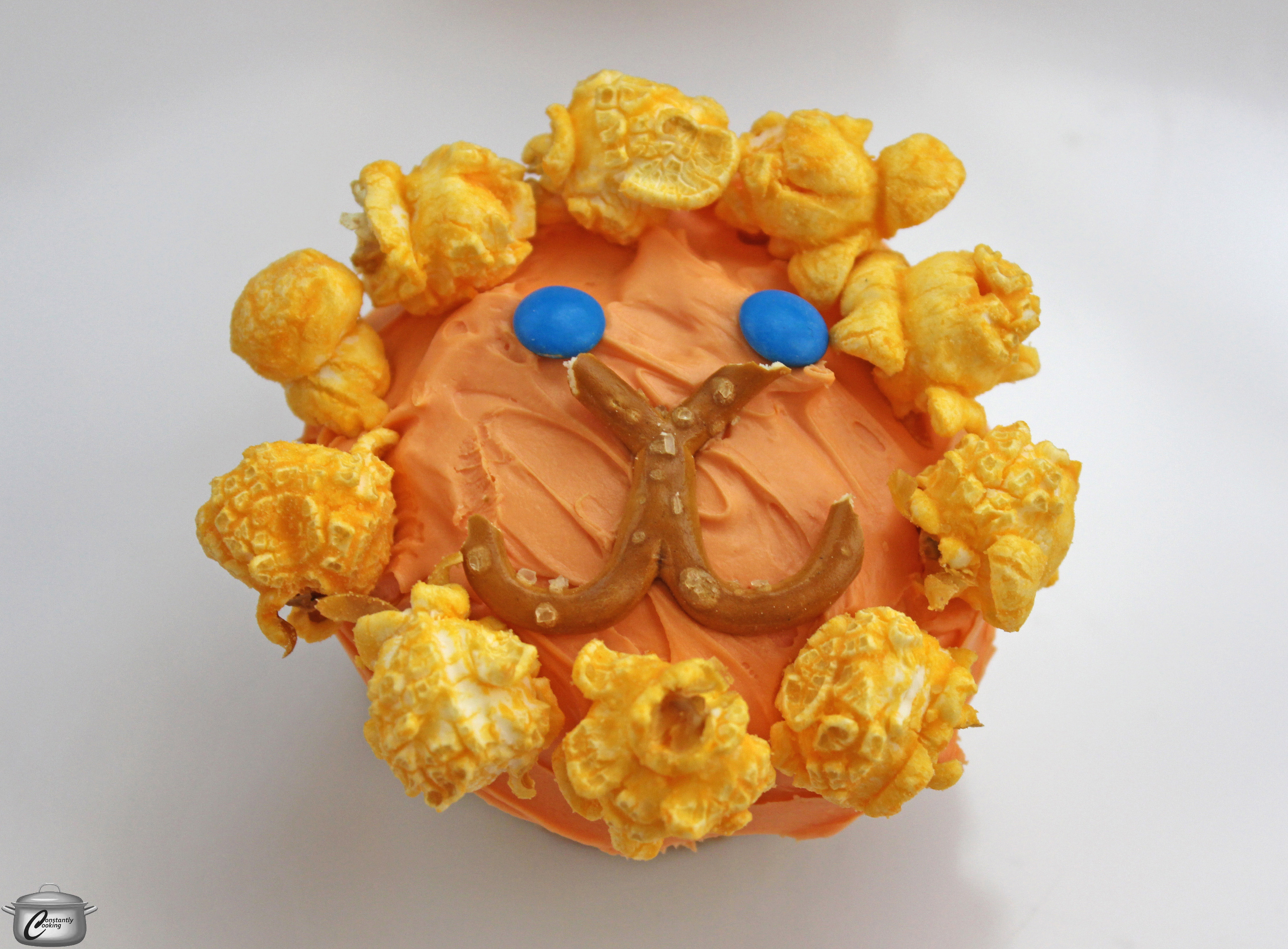 - To decorate, trim the domed top off each cupcake with a serrated knife, to make a flat area for the lion’s face. Spread the frosting on the cupcakes with a knife. Add eyes and mouth, then place popcorn around the outside to form the mane.