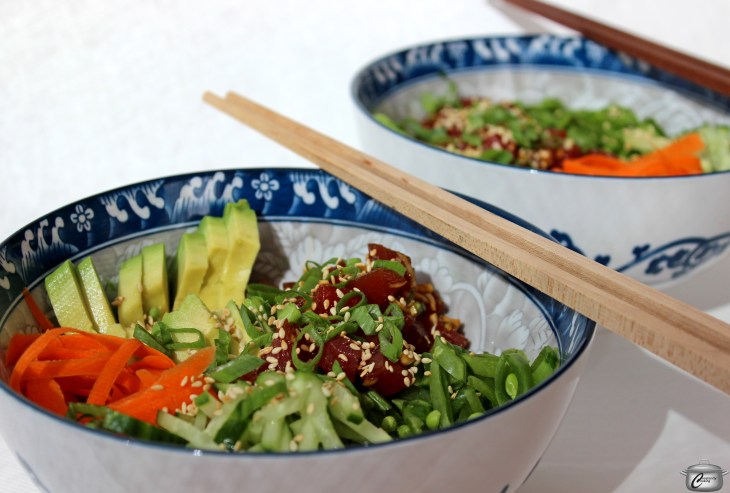 Poke (pronounced poke-ay) hails from Hawaii and burst onto the Canadian food scene in 2016. This bowl version is a delicious dish that’s as healthy as it is beautiful, packed with vibrantly-coloured raw vegetables and marinated sushi-grade tuna. For an extra speedy meal, you can cook the rice, prepare the vegetables and marinate the tuna ahead of time then pop everything into the refrigerator. When it’s time to eat, it will take less than five minutes to assemble these tasty bowls. If you like this dish, you’ll probably also enjoy my sushi bowl recipe. If you’re lucky to have a reliable fishmonger nearby for the tuna that’s fantastic, but if not, don’t despair – many large grocery stores sell good quality tuna today.