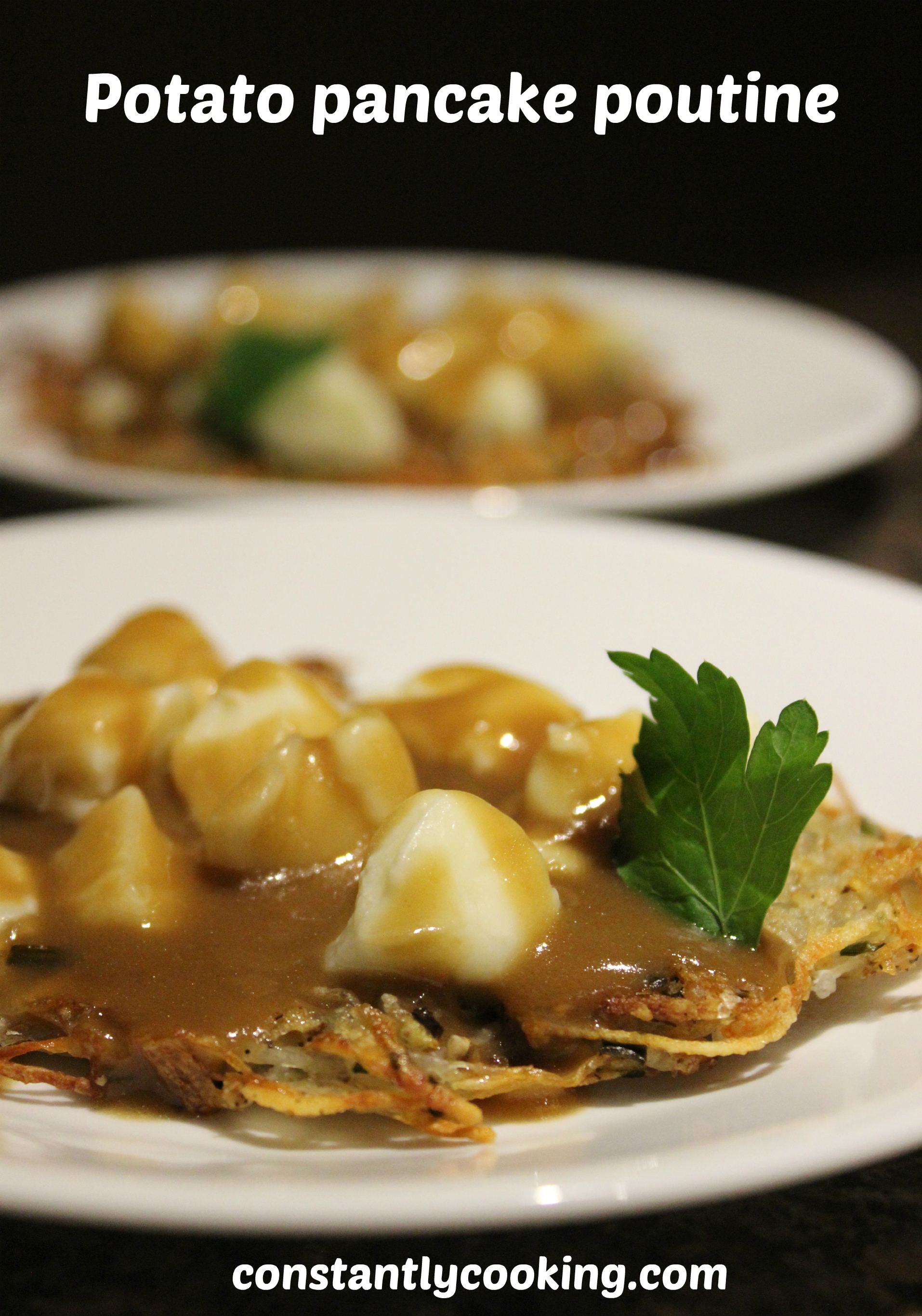 As you might imagine, my taste testers are pretty happy with their roles in the Constantly Cooking kitchen. They are generous with their time and their suggestions, not all of which I choose to heed. Their tastes are also a little different than mine which is helpful when I am creating dishes like this that are not exactly in line with the lighter, fresher fare I tend to prefer. Upon tasting his first bite of this dish, my husband was heard to exclaim, “this might be the best thing I have ever eaten.” I don’t know about that, but I do know this is a super tasty and fun dish that would be really fun to prepare with kids or teens. The potato pancakes are light and crispy and can easily be cooked ahead of time then reheated. I prefer the easy-to-make homemade gravy explained below as it is less salty but you can easily substitute with purchased canned gravy or poutine sauce. You can also throw a little pulled pork on top if you really want to have some fun.