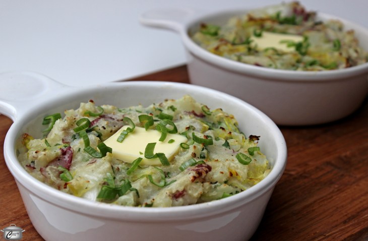 Maybe it’s because my dad grew up on a potato farm in Prince Edward Island, or maybe it’s because potatoes are just so delicious, versatile and filling, but I absolutely adore these tasty tubers. While I also love other starchy things like pasta and rice, potatoes are definitely one of my very favourite comfort foods. I decided that in honour of St. Patrick’s Day, this year I’d try to refresh a recipe given to me by an Irish friend years ago. Colcannon is a popular Irish dish made from potatoes and greens – typically cabbage or kale – and there are myriad ways to prepare it. For my version, I chose red skinned potatoes, unpeeled, for extra fibre and nutrition, plus I and included parsley to add more vibrant green colour to the finished product. I also decided to prepare the Colcannon in individual serving dishes to ensure fair distribution and enjoyment of the melted butter. Lastly, I had a hunch that a quick trip under the broiler just before serving to crisp up the top would be a good idea; it also means the dish is nice and hot when you go to serve it. You’ll note some make-ahead instructions below. As for what to serve this with? We eat it on its own but it would be equally terrific with corned beef (check out my fantastic Instant Pot version), sausages, ham, roast chicken or fish.