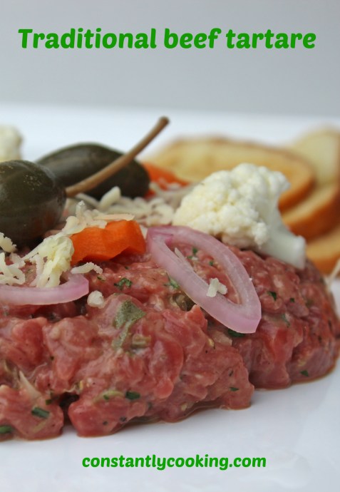 - To serve, mound the beef tartare on a serving plate and garnish with pickled vegetables, caper berries and/or cornichons and grated cheese. Serve with crostini.