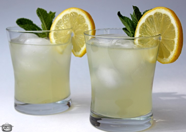- To serve, fill glasses with ice. Add a 1.5 oz (3 tbsp / 45 mL) shot of gin, if using, then add enough lemonade mixture to fill the glasses 3/4 full. Top with tonic water or club soda. Garnish with mint leaves and lemon slices and serve.