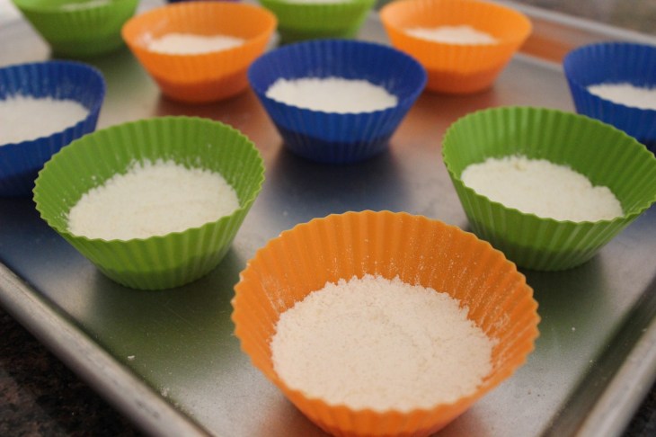 - Divide crust mixture among 12 lined muffin tin compartments (approximately 5 teaspoons/25 mL each). Press firmly and evenly into the muffin liners as shown above (I used silicone ones).