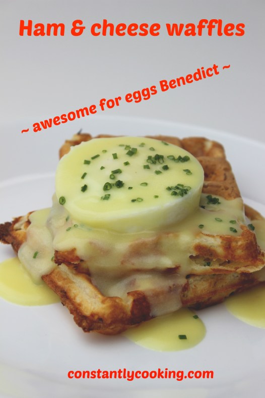 Anyone who knows me knows I am infatuated with waffles. I love sweet variations, served with fruit and maple syrup, of course, but lately I’ve been playing around with savoury waffles too. These cheddar and onion beer bread ones were a huge hit, as were these chive cornbread waffles. But I have to say, this latest variation really hits it out of the park. Light, fluffy and crammed with flavour. I can see using these waffles in all sorts of inventive ways (grilled cheese sandwiches, perhaps). I like to measure out the dry ingredients the night before, as well as prepping the chives, ham and cheese and tucking it into the fridge so that the assembly time in the morning is super speedy. Like most waffles, these reheat beautifully in the oven (or even in a toaster) so you can cook them ahead of time if you prefer.