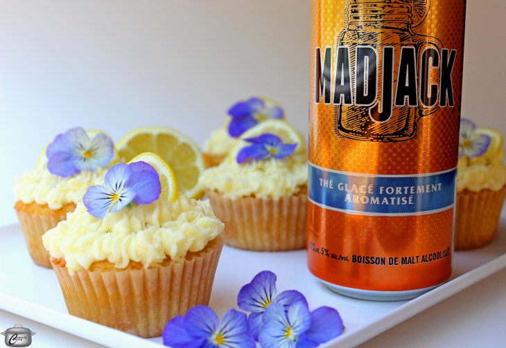 A lifelong fan of iced tea, I didn’t know what to expect the first time I tasted a ‘spiked’ version. I was pleasantly surprised to discover the tea and lemon flavours still predominated and found the drink to be quite refreshing. A recent offer to try a new-to-me version called MadJack Hard Flavoured Iced Tea got me to thinking about how alcohol can really perk up the flavour of some baked goods….and so, this cupcake recipe was born. The malt beverage’s unique flavour shines through in a subtle but pleasing way in the cupcakes and the lemon buttercream icing also gets a boost from MadJack. I’m so happy with the way these turned out, I’ll likely repeat the experiment with some of their other products – the Apple Lager in particular sounds quite intriguing!