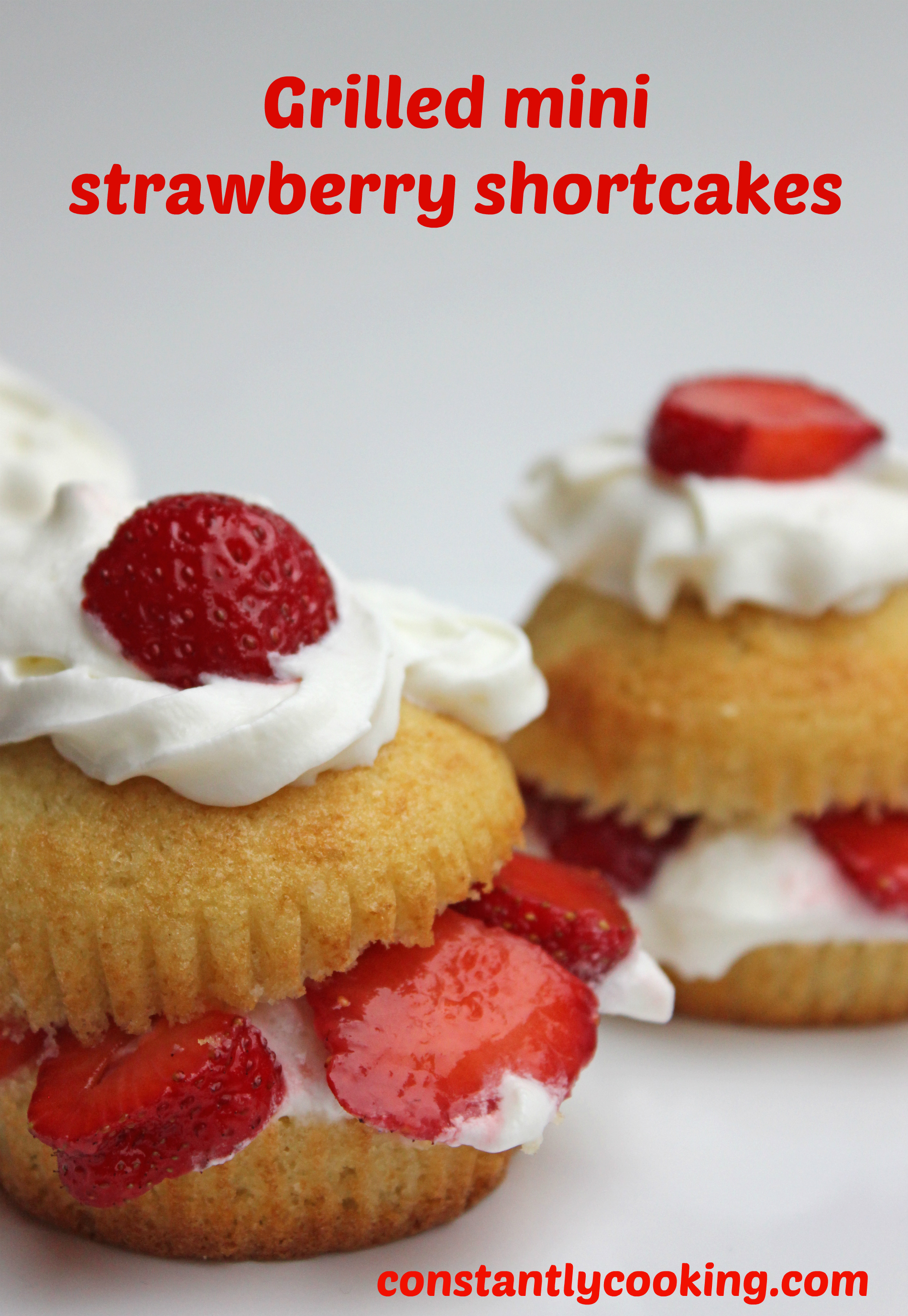 - Put the bottom sections of the grilled cupcakes on a serving platter, grilled sides up. Top with whipped cream and sliced strawberries. Place the tops on, grilled sides down, then add more whipped cream and berries.