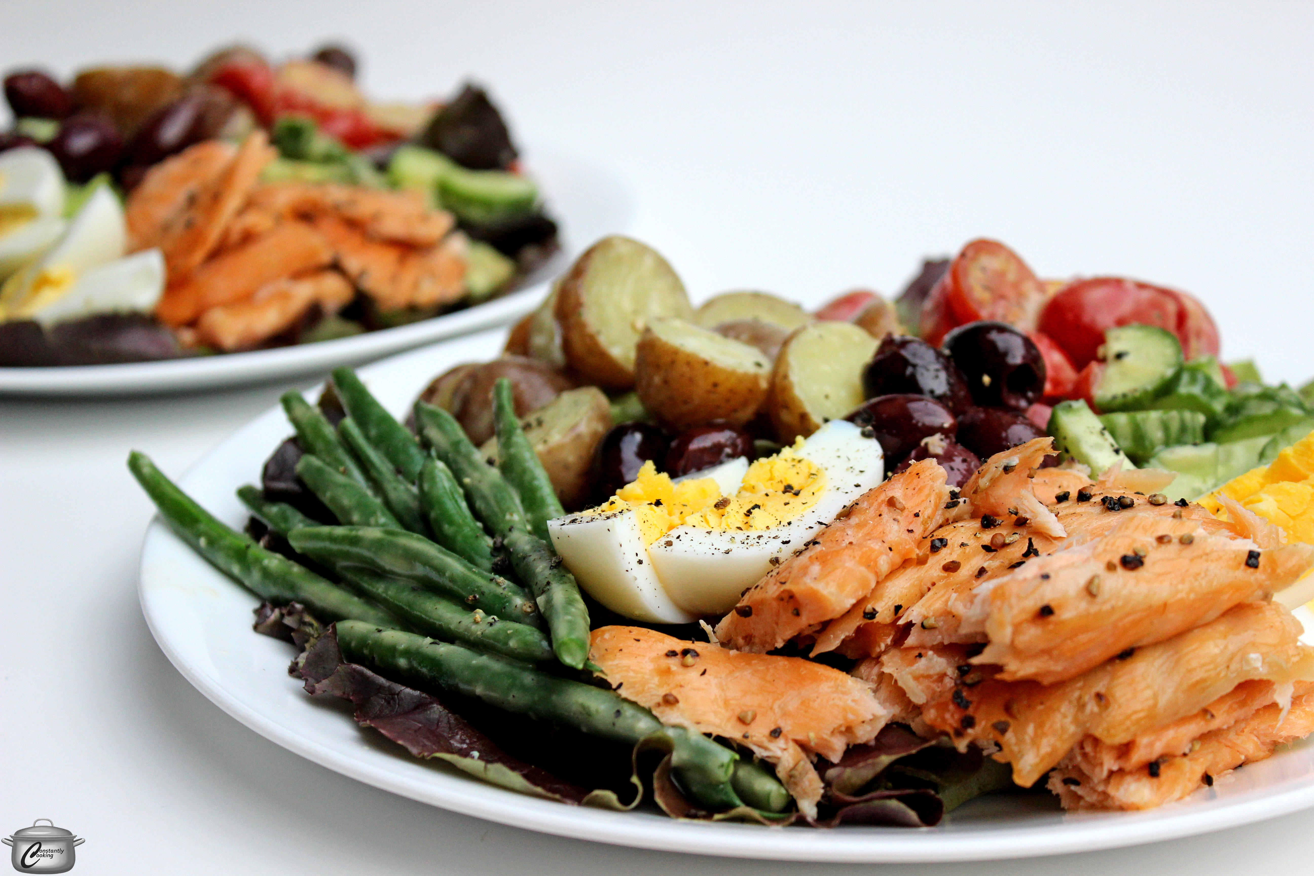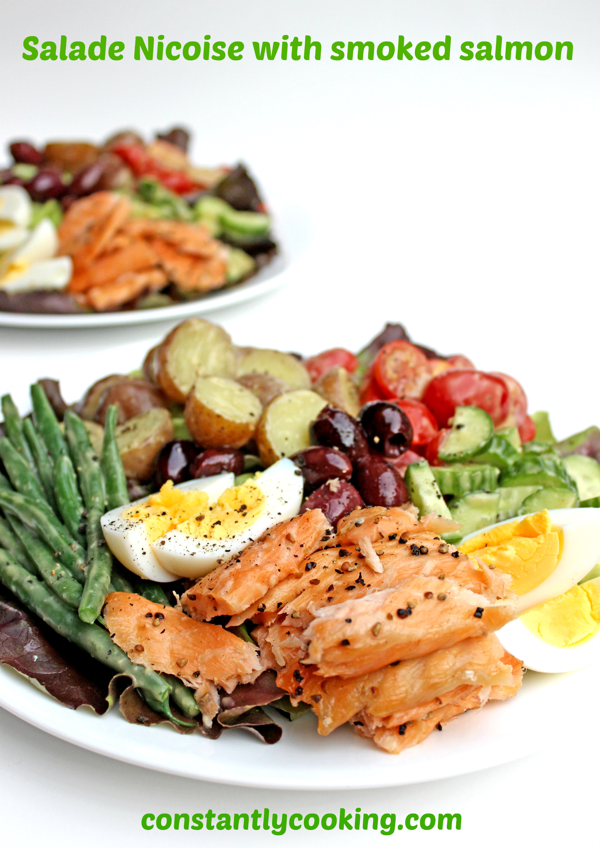 During the hottest part of the summer, we eat composed salads quite often for dinner. With the right ingredients, they can take little time to prepare and be both nutritious and satisfying. I’m a huge fan of the classic Salade Niçoise which typically features either anchovies or cooked tuna as its main protein, but just for fun I made it with smoked salmon and it was a huge hit! Look for thicker smoked salmon strips if you can find them as they have a different texture and flavour than the thinly sliced varieties you may be more familiar with (although those would be tasty too). I enjoy preparing the potatoes, beans and hardboiled eggs early in the day; the beans and potatoes can be kept, covered, at room temperature while the eggs must be refrigerated. You can also make the vinaigrette ahead of time and re-whisk or re-blend it just before serving. With this work done, it takes just moments to assemble and serve this delicious meal. Pair it with a crisp white wine and some crusty bread.