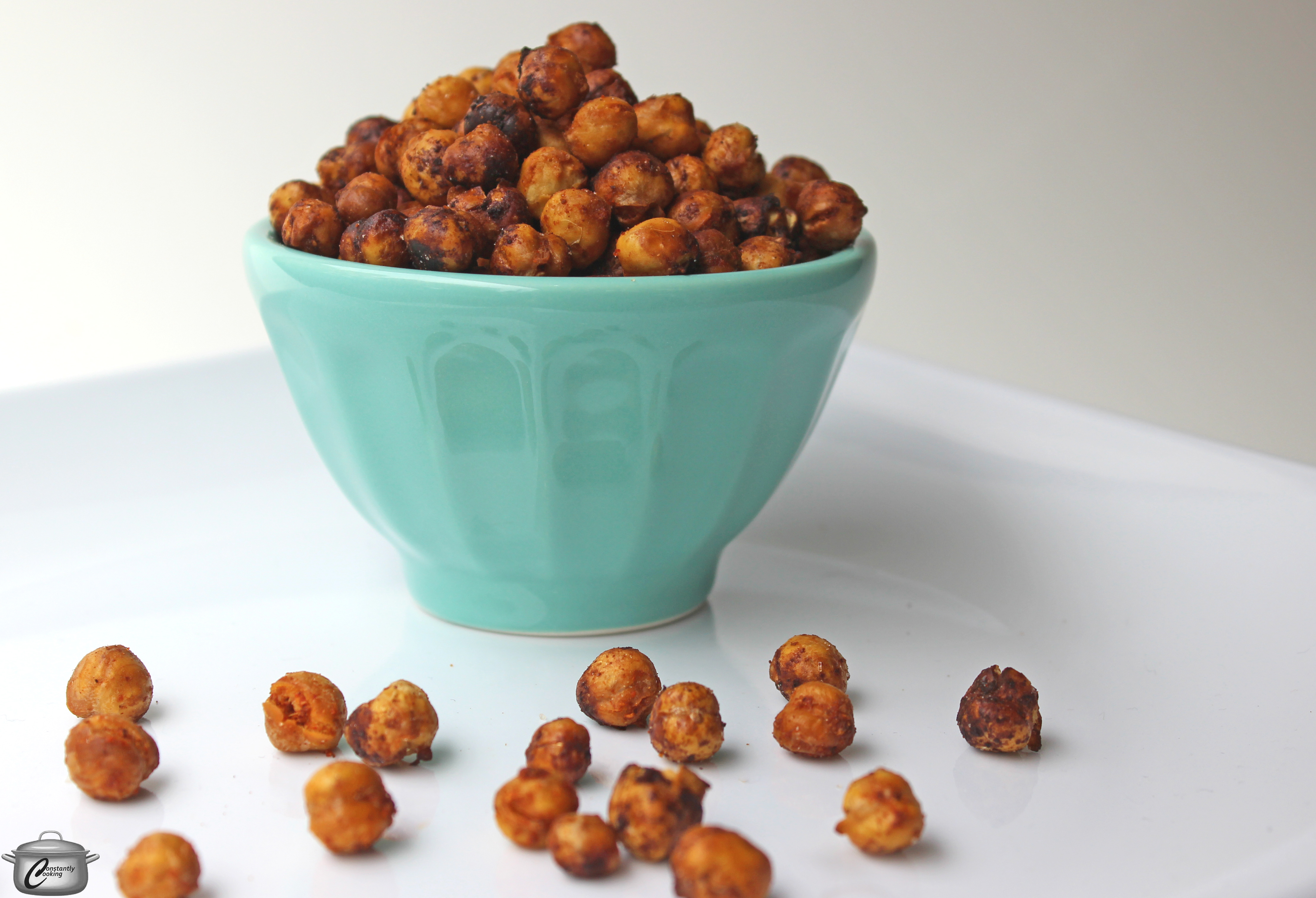 - Remove roasted chickpeas from air fryer or oven and add to seasonings in bowl then very quickly toss to coat. Sprinkle with salt and toss again.