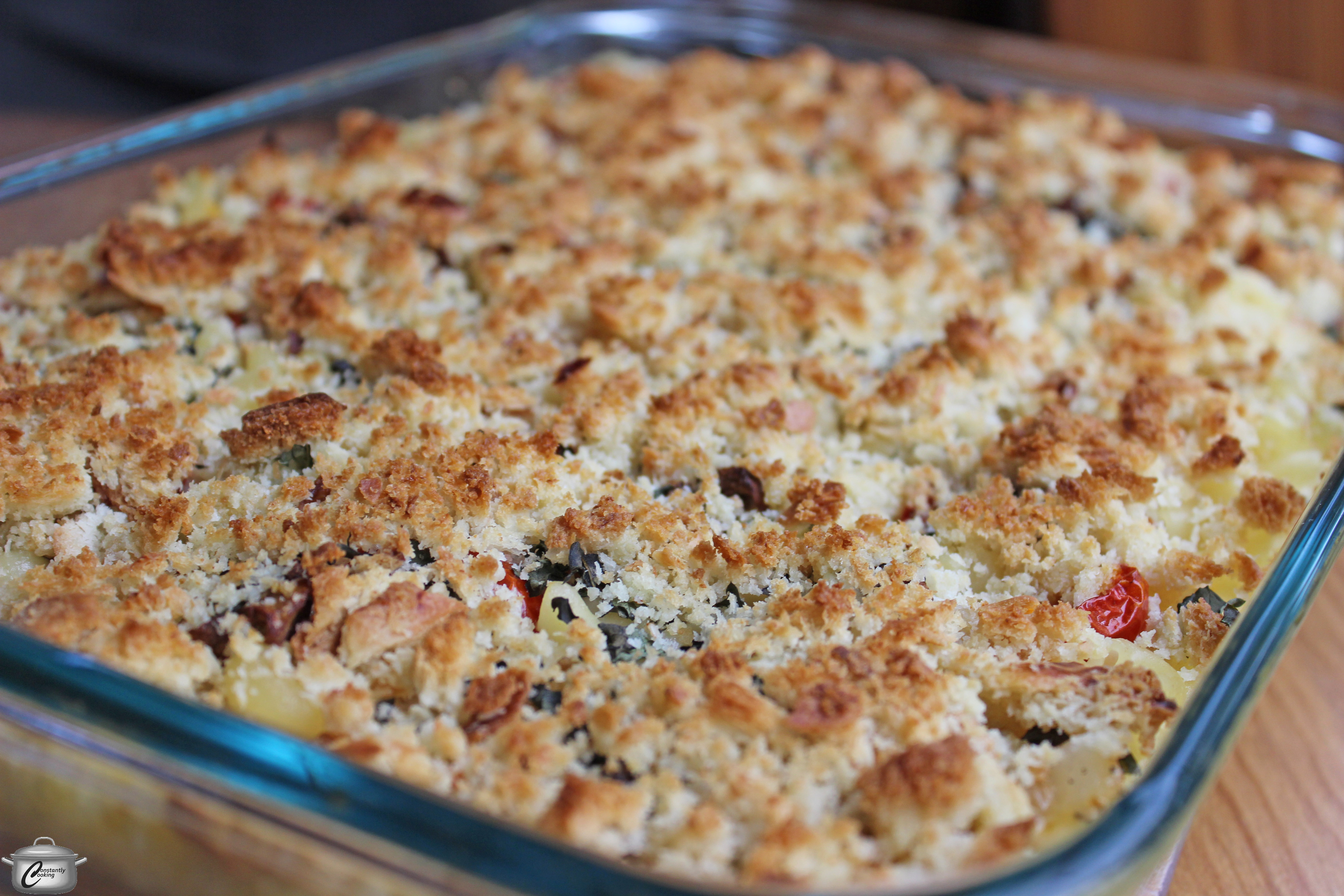 - Pour the cheese sauce over the cooked noodles in the baking dish. Sprinkle roasted vegetables on top, followed by chopped basil and breadcrumb topping.
