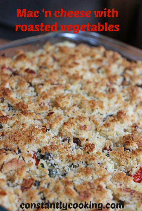 In my home, nothing says comfort food better than homemade macaroni and cheese. It is our favourite Meatless Monday meal! I had a surplus of fresh produce from the Farmers’ Market this week so decided to add some roasted vegetables to this week’s edition of mac ‘n cheese and it was a big hit. Next time I think I’ll try adding in a few more vegetables – roasted squash or cauliflower would be really great flavour boosters, I think.