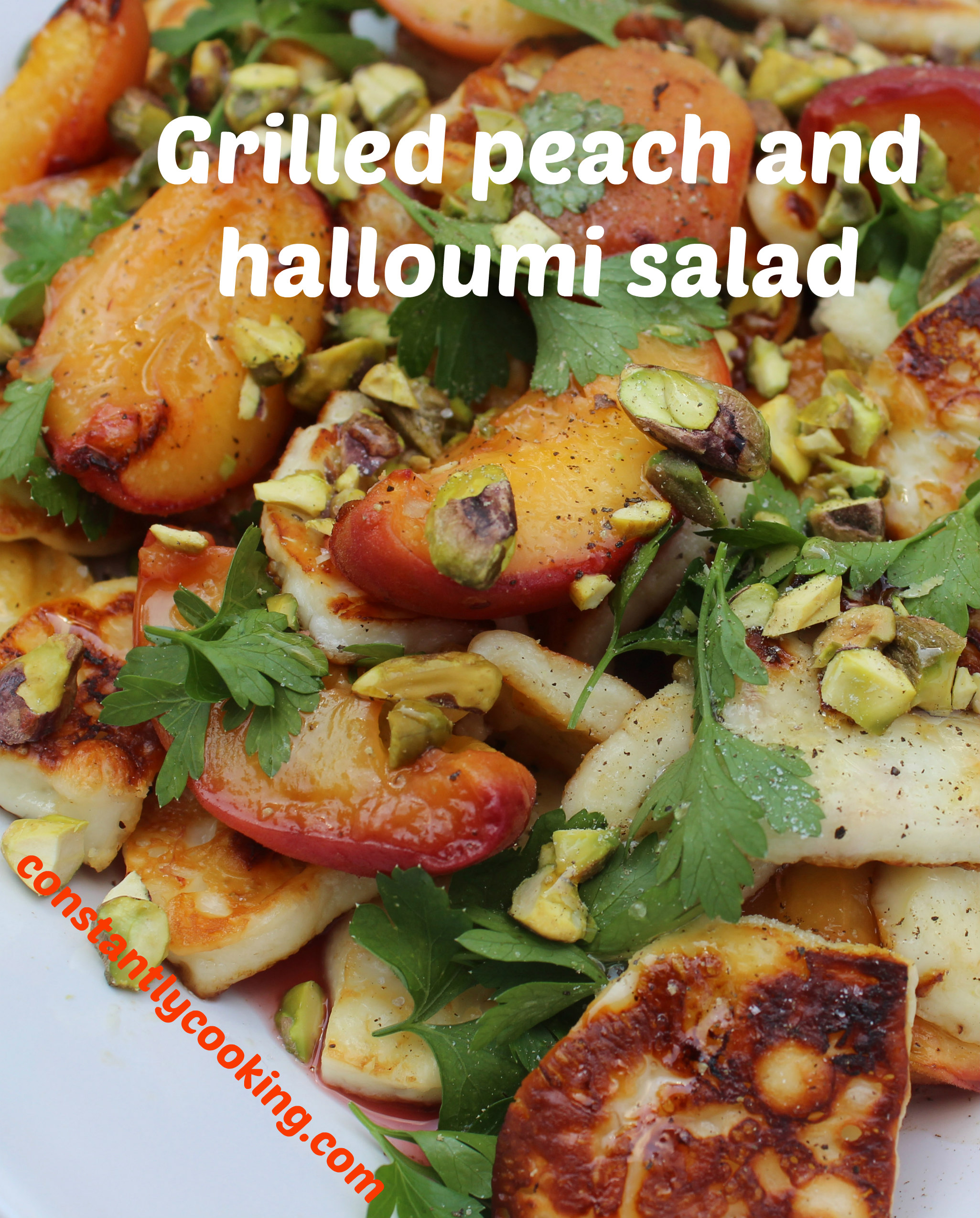 • Put the halloumi slices in the same bowl that the peaches were in and drizzle remaining oil over top.