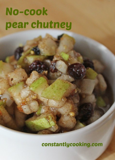 I love serving chutneys with roasted meat of any kind. They can serve as a side dish or even a stuffing. They’re a great way to add a pop of flavour and often a way to tempt kids to try new things, lured by the promise of something sweet or tangy. I am also a fan of tucking a few dollops of chutney into my grilled cheese sandwiches and you’ll usually find a little bowlful on my cheese boards too. Depending on what texture you prefer, you can dice the fruit and onions, or grate them (use a box grater) if you want a finer textured chutney. You can enjoy this pear chutney the same day you make it, but its flavour will improved with a day or two of refrigeration.