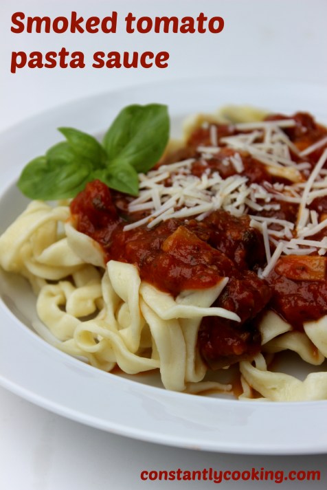 I’m a big fan of smoky foods, particularly when those foods are fruits or vegetables. My smoked tomato gazpacho is a case in point, as is my smoked watermelon salad. When asked to produce a smoked tomato pasta sauce, I was more than eager to oblige and I’m super happy I did because this is ridiculously delicious and probably the best-tasting sauce I’ve ever made – and it’s vegan! One of my taste testers enthusiastically commented that “it’s like having my favourite food around a campfire!” I’m off to the farmers’ market right now to buy a bushel of tomatoes to smoke, chop and tuck into the freezer. I suggest you consider doing the same thing. Oh – and if you’re wondering about the smidge of baking soda in my tomato sauce, don’t skip it as it is the perfect neutralizer for the tomatoes’ acidity and makes for a smoother, richer, tastier sauce. I promise.