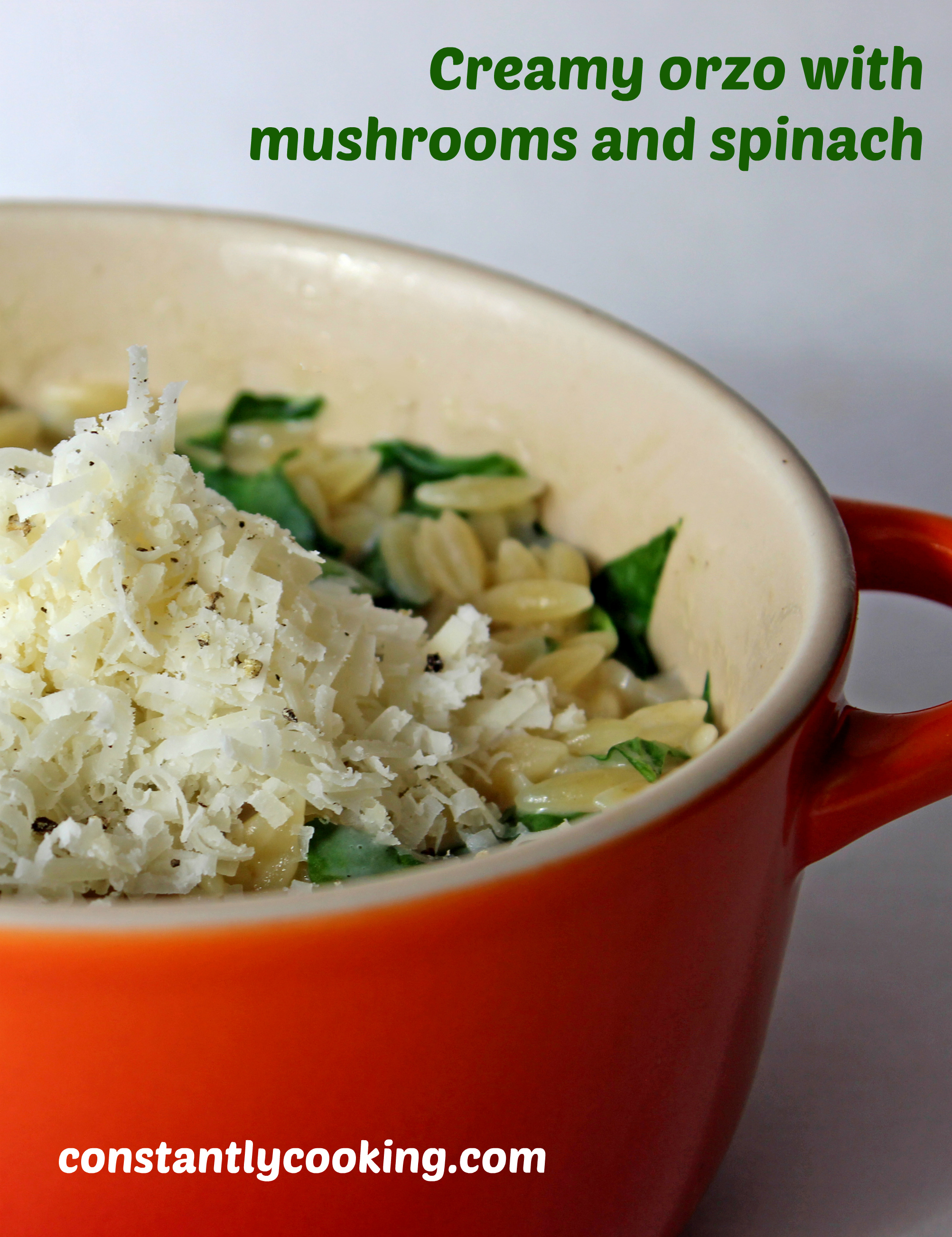 I have been noticing a lot of one-pot dishes popping up on my social media feed lately. The funny thing, however, is that a lot of them aren’t actually one-pot meals. The meat and vegetables might get cooked in one pot, but then you have to prepare rice or pasta in a second pot to go with it. In the spirit of making a true one-pot meal, I turned to orzo, a small rice-shaped pasta that cooks very quickly and holds its shape. This dish reminds me of mac ‘n cheese, except it takes less time to prepare. Like many of my recipes, this one is absolutely customizable.You can use shredded kale instead of chopped spinach, but give it an extra minute to wilt. Glam it up by adding a little diced prosciutto along with the mushrooms, or by finishing it with a sprinkle of truffle salt or a drizzle of truffle oil. I love this dish because in my busy world, any dinner that is both delicious and ready in under 15 minutes is a real winner.