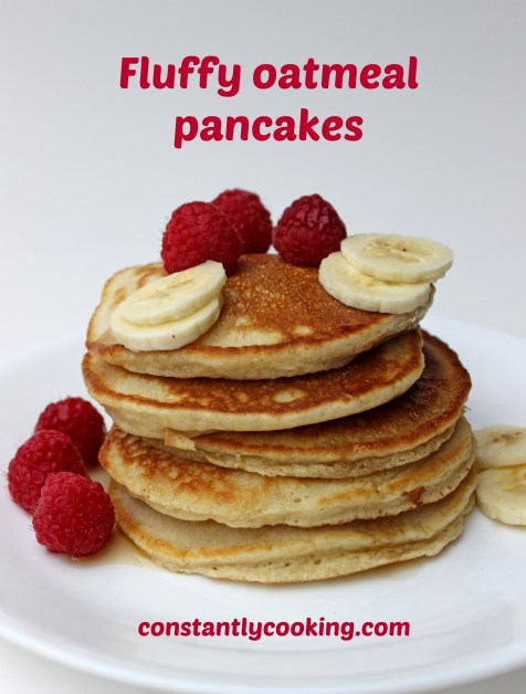 For me, pancakes have always been one of those breakfasts that taste great, but are rarely wholesome enough to keep me full all morning. Maybe I were able to eat a huge stack, say 8 or 10, it might be a different story, but I’m always a 3 or 4 pancakes at the most person. I’ve tried making oatmeal pancakes in the past but found they were a little too dense and chewy for my liking. A ‘eureka’ moment the other day after a friend asked me for a gluten-free pancake recipe made me load up my blender with ingredients and the resulting batter cooked up as light and fluffy as could be, despite having a generous measure of quick cooking rolled oats inside. I think I’ve found my ‘forever’ pancake recipe!