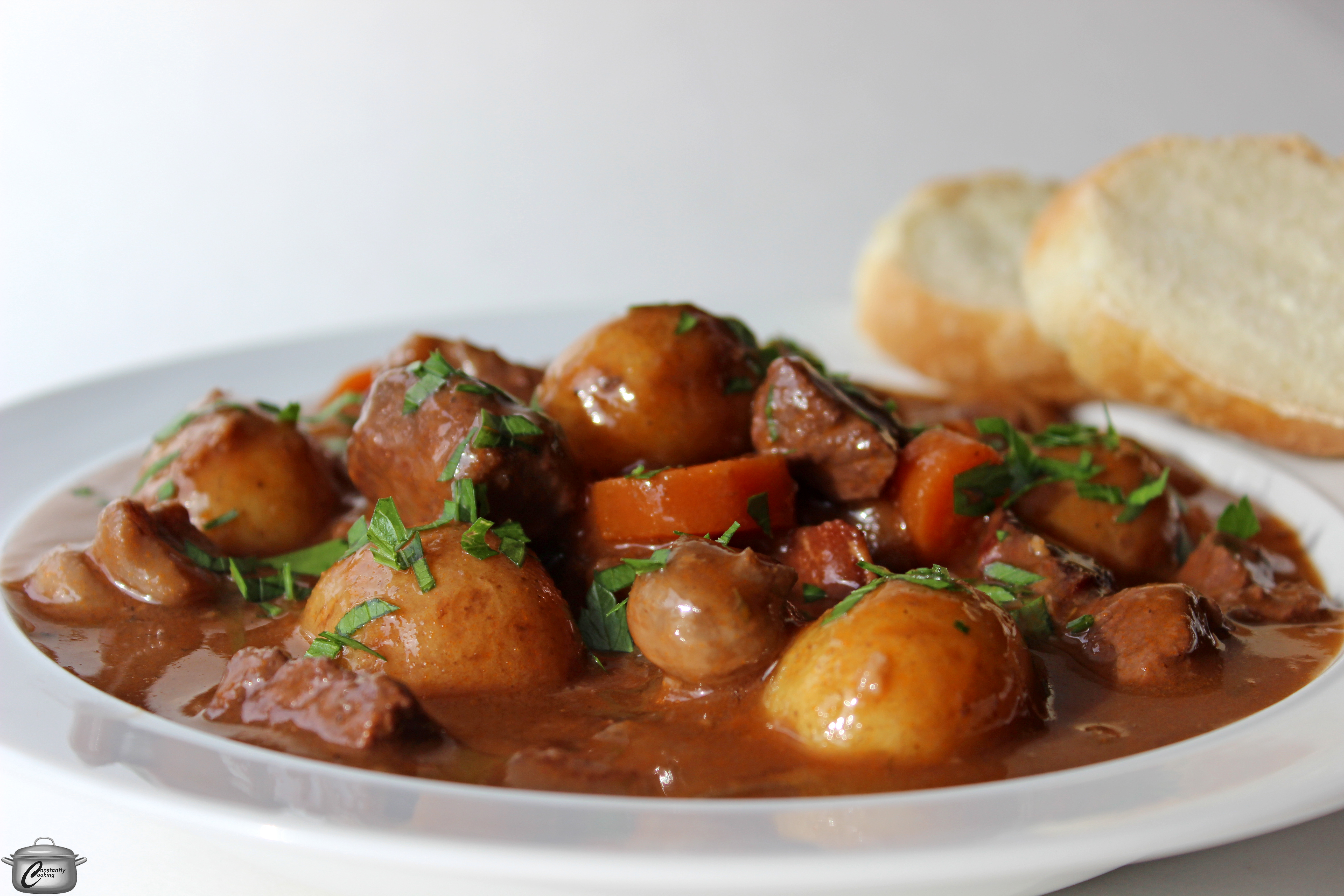 - Cover pot and bring the mixture to a boil then add in potatoes and carrots. Bring to a boil again then cover and transfer to the preheated oven. Let cook for 1.5 hours. Check once or twice and add a few tablespoons of water or red wine if the liquid has evaporated somewhat and the meat is not covered.