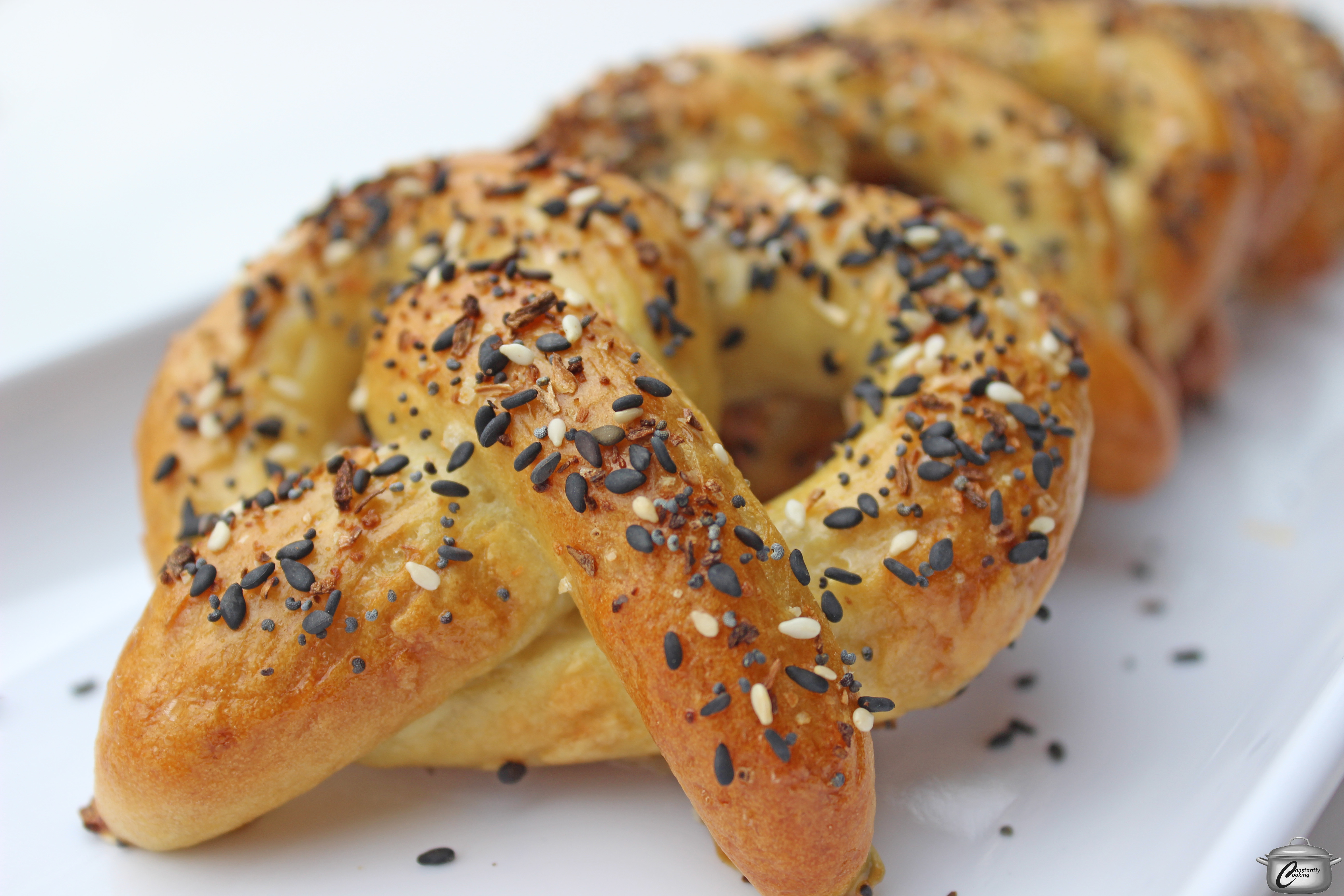 I remember the first time I made pretzels with my kids. They were so intrigued by the whole process, and were right by my side as we made the yeast dough, let it rise, shaped the twists, boiled them, topped them and finally baked them. Needless to say, the eating was their favourite part of all. You can top pretzels any way you like – with coarse salt, cinnamon and sugar, sesame seeds…or nothing at all… but I love them topped with my ‘everything bagel’ seasoning blend. Enjoy as is, dipped in honey mustard, or as the star of a sandwich.
