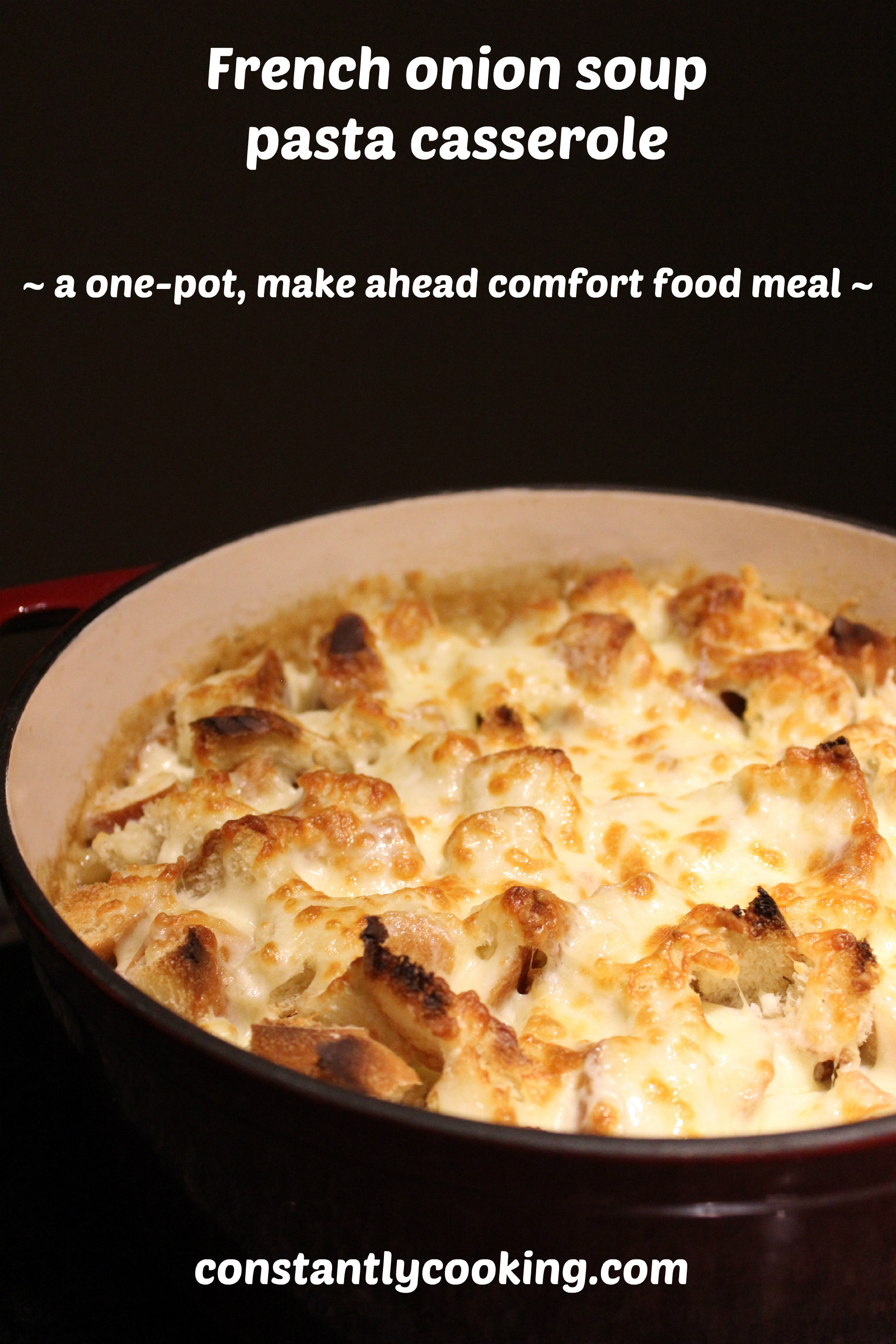 I’m convinced this is the dish that’s going to get me through this winter. The addition of slivered beef and pasta to a classic French onion soup base makes for an out of this world, hearty and flavourful meal. Even better, it’s prepared in one pot on the stove, then finished with a quick trip under the broiler. My taste testers were literally speechless while devouring this dish; as soon as they’d just about licked their plates clean, they requested I make it again this week. You can substitute chicken for beef if you like, or omit the meat entirely. If you don’t have a large enough oven-safe pot, simply prepare the dish on the stovetop then transfer the mixture to a casserole dish, add topping and broil. For a more elegant presentation, why not assemble single-serving sized casserole dishes? If you want to go old-school and just make French onion soup, here’s my tried-and-true recipe, upon which this new dish is based.