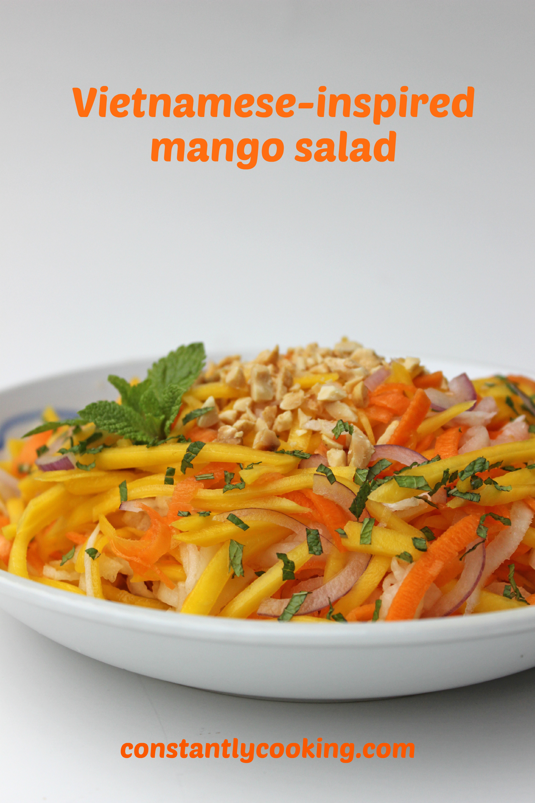 I don’t know about you, but I’m craving a little heat and a lot of sunshine on my plates these days. A meal at Vancouver’s exceedingly popular Ahn & Chi restaurant was the inspiration for this bright, flavourful recipe. I think folks line up down Main Street every night there for more than just the fantastic mango salad, as every dish I’ve tasted on my two visits was spectacularly delicious. For this recipe, lightly pickling the mango and vegetables softens their texture and eliminates some of the daikon’s natural bitterness. Soaking the red onion in a cold water and baking soda mixture serves to moderate the harshness that is typical of raw onion – it’s a method I’ve used for a long time and it works really well. You could add julienned seedless cucumber to this dish if you like. This salad is best enjoyed as soon as it’s made but will keep in the fridge for up to 24 hours.