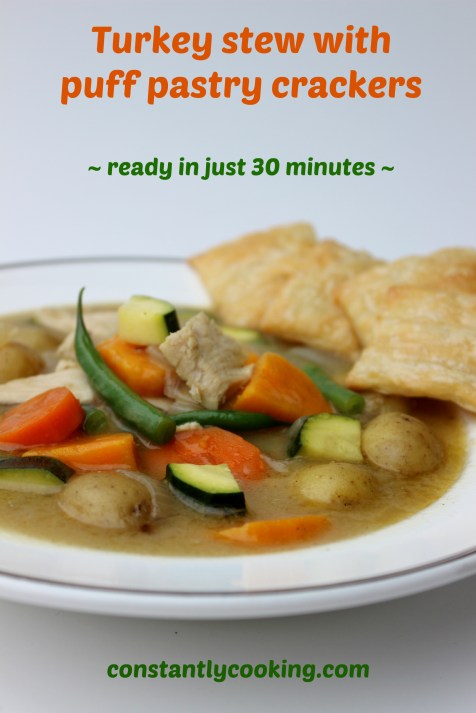 I’ve loved turkey and chicken pot pie since I was a little kid. I remember being so impressed that leftover cooked poultry could be transformed into something so delicious and, of course, the pastry crust that my mom put on top was always flaky perfection. I switched things up and started using storebought puff pastry on my meat pies years ago – it’s a shortcut I’ve been very happy with, although sometimes I found it tricky to get the pastry as crispy all the way through as I wanted it to be. This recipe solves that problem, since you bake the pastry separately from the cooked vegetables, turkey and gravy. It’s been such a hit at my house I doubt I’ll ever make it any other way now.