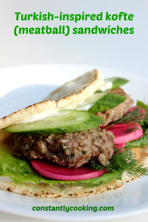 My son recently gave me a fun gift: The Turkish Cookbook by Musa Dağdeviren, whom you may have seen on the popular Netflix show, Chef’s Table. I was excited to leaf through it and one of the first recipes that caught my eye was – I kid you not – ‘Ladies’ Thighs Meatballs’ (Kadinbudu köfte in Turkish). How could I resist? Kofte (also called kofta) is a name applied to a broad assortment of meatball-type dishes found among the cuisines across a vast swath of the world including the middle East, Mediterranean, Indian subcontinent, South Caucasus, Balkans, and central Asia. The “ladies’ thighs” version gets its name from the meatballs’ flattened, oval shape. I chose to bake my meatballs instead of frying for an easier, healthier version and was very happy with how they turned out. We tucked them in pitas with all sorts of toppings the first day, then reheated the remaining meatballs and crumbled them over salad made from the leftover toppings on day two – a great gluten-free option! I’ll be making this dish again and again as it was so easy, flavourful and satisfying. Because the meatballs are delicious warm or at room temperature, it will be a perfect summer picnic food.