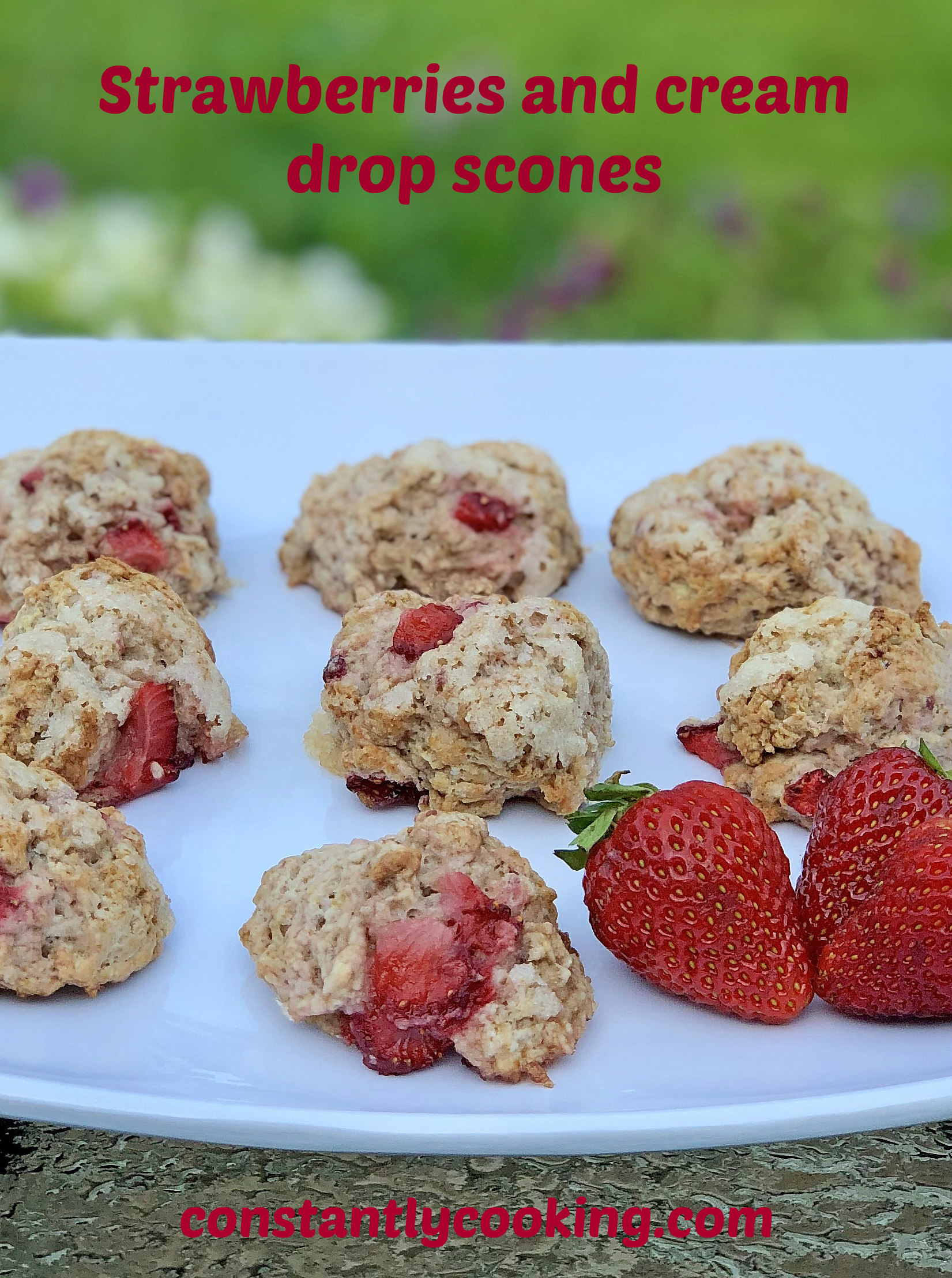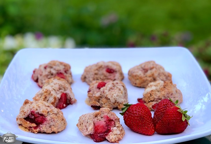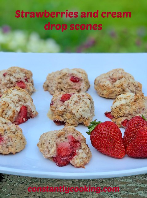 I adore making scones and biscuits but sometimes find I am not in the mood to roll out and cut the dough. Drop scones are a great solution as they are fast and easy to prepare. These ones have just the perfect amount of sweetness and the subtle strawberry flavour shines through beautifully. To speed up the final preparation, you can blend the liquids together the night before (cover and refrigerate) and grate the butter into the flour mixture (also refrigerate it). In the morning, simply dice the remaining strawberries and proceed with assembly. You can easily use your favourite gluten-free flour blend in this recipe.