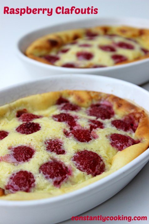 Clafoutis is considered by many to be one of the quintessential desserts of France. The popular treat is surprisingly easy to make, yielding a fruit-filled delight that falls somewhere between a cake and a custard. Based on a traditional crêpe batter, clafoutis is typically made with sweet cherries (purists would insist they need not be pitted, though I beg to differ) yet the recipe lends itself to using any fruit that’s not going to release too much juice into the batter while cooking. I’ve tried (with great success) blueberries, blackberries and quartered small apricots but I keep coming back to raspberry as it’s just so pretty and flavourful. You can make clafoutis up to a day ahead and refrigerate after baking. I love preparing it in individual serving dishes as shown below, but it’s easy to serve out of a large baking dish as well.