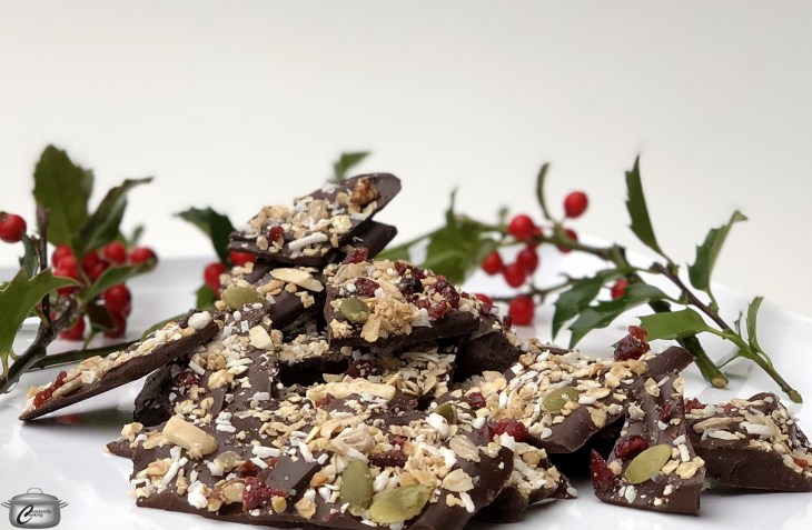 We’ve been told for years that eating dark chocolate is good for our health in multiple ways, so I decided to make a good thing even better by adding some heat. And guess what? Chili powder is also good for us – it can lower your body’s sugar levels and reduce the amount of insulin your body needs. The next addition: cinnamon, a powerful anti-inflammatory and antioxidant with also lowers blood sugar levels. The crowning touch for this healthy treat is granola, adding a burst of fibre, crunch and flavour to this not-too-sweet treat. I’ll be gifting a lot of this simple to prepare snack this holiday season. For other quick and delicious giftable ideas, check out my salted caramel pretzel bark and my salted caramel mocha bark.