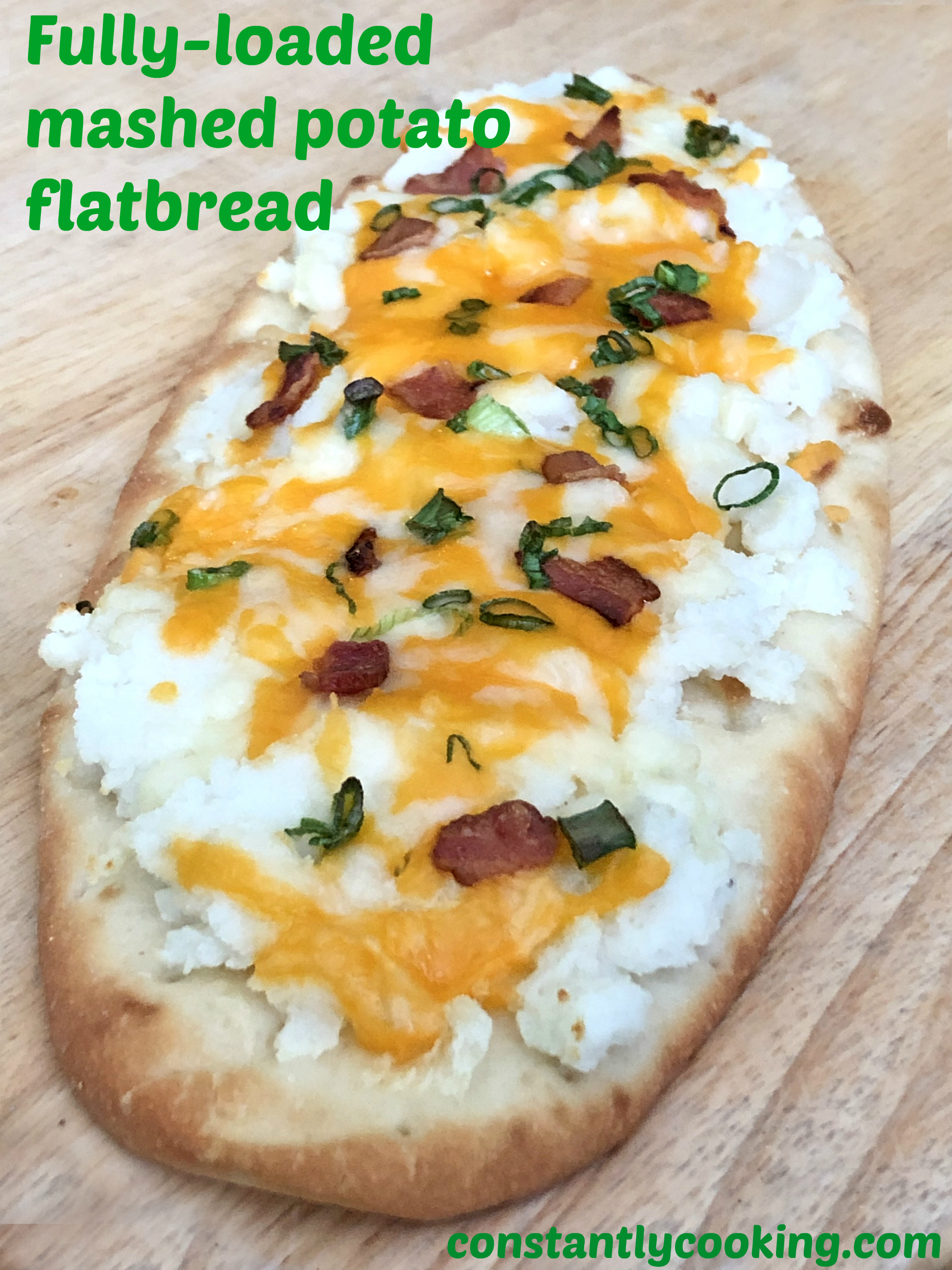 This dish would make a fun ‘assemble-your-own’ station at a party. The flatbreads are super easy to prepare and take just moments to cook. They’re easiest to make if your mashed potatoes are smooth and not too stiff; beat a little milk or water into the potatoes to thin them out just a little, if necessary. It’s easy to make this dish vegetarian by omitting the bacon (or substituting with coconut bacon); you can also switch up the grated cheese and sour cream for vegan version if you wish. Flatbreads are available in the bread section of most large grocery stores; you can use naan, pita bread or even pizza rounds if you prefer. If you enjoy this recipe, you might also like my baked potato chowder.