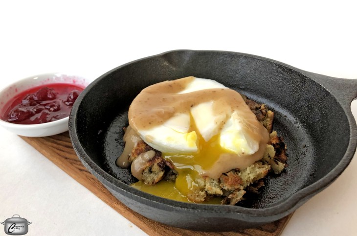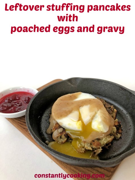 - Slide the cooked egg on top of the stuffing pancake and drizzle hot gravy over top. Serve with cranberry sauce if desired.