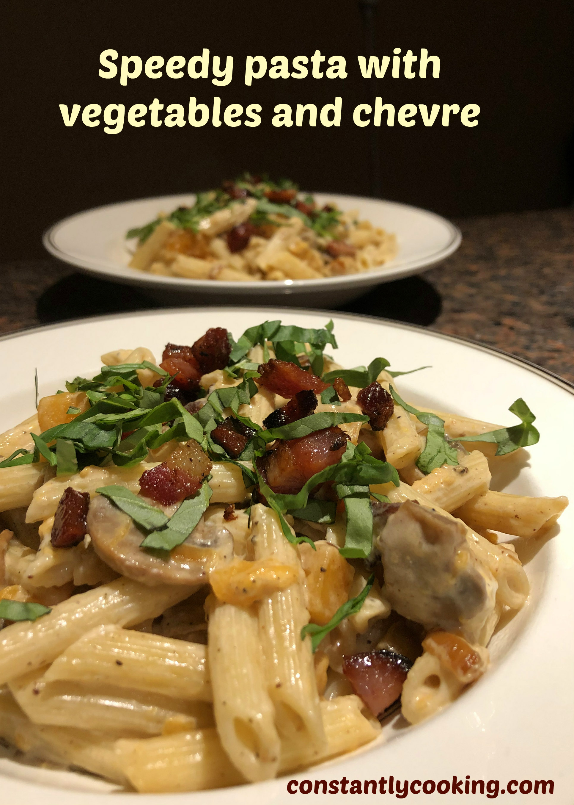 This pasta tastes so good you might be surprised how quickly it can be prepared, since there’s no fussy sauce to assemble. I previously shared my recipe for deliciously addictive vegan coconut ‘bacon’ bits (you can omit, or use regular bacon if you prefer) and you can even use a non-dairy creamy cheese product instead of the chèvre (goat’s milk cheese) if you want to make the whole dish vegan. If you have leftovers, add a little water to the pasta before reheating and you’ll have deliciously creamy sauce once again.