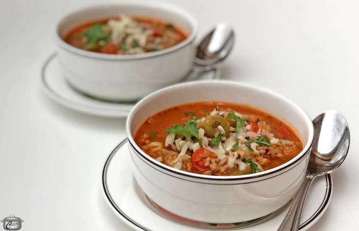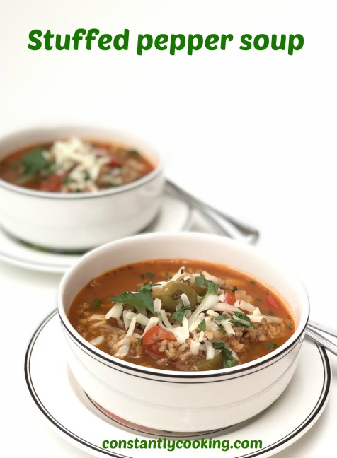 When I revisited stuffed peppers to come up with a more contemporary version a few months ago, it reminded me of how much I enjoyed this classic flavour combination. It’s nourishing, comforting, delicious and satisfying. While I’ll continue to make my snazzier stuffed peppers often, I wanted a version of that dish that would be a little more portable and this is it. I love taking thermoses of soup on our winter adventures and this will likely be a recipe I turn to time and time again. Note that if you want to make this recipe ahead of time, it’s best to prepare the meat, vegetables, broth and seasonings and then stop at that point. The mixture can be refrigerated for up to 48 hours. 45 minutes before serving, reheat the soup base; when it’s simmering, add the rice and cook until tender before serving. If you prepare the complete soup ahead of time the rice will absorb too much liquid. To reheat leftovers, more broth or water may be needed to return the soup to an ideal consistency.
