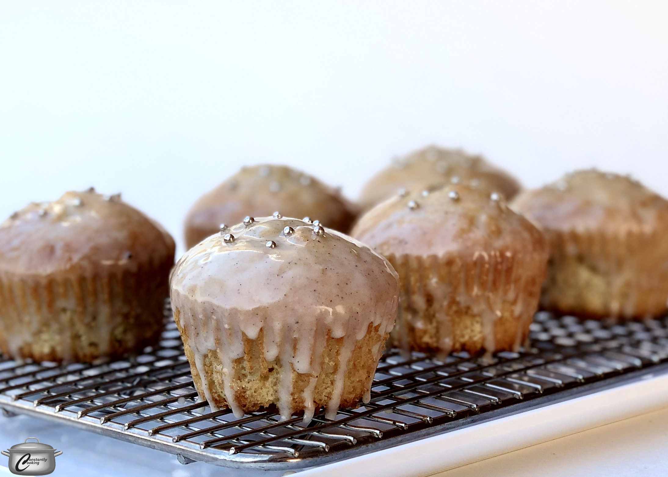 - To make glaze, beat together icing sugar, vanilla and 1 tablespoon water in a medium-sized bowl, adding additional water a few drops at a time until a smooth, pourable but still thick glaze has been created.