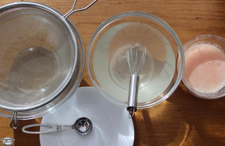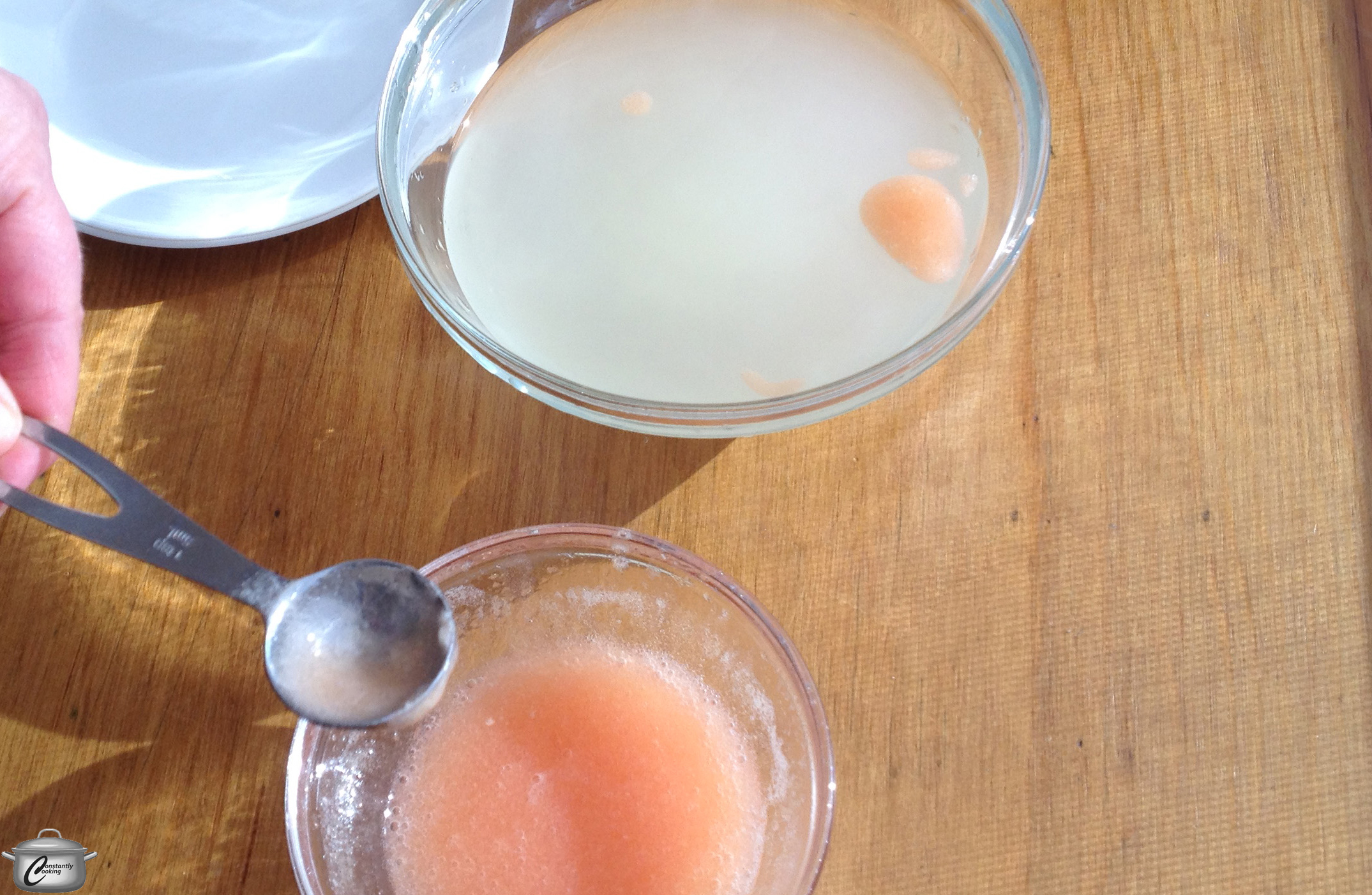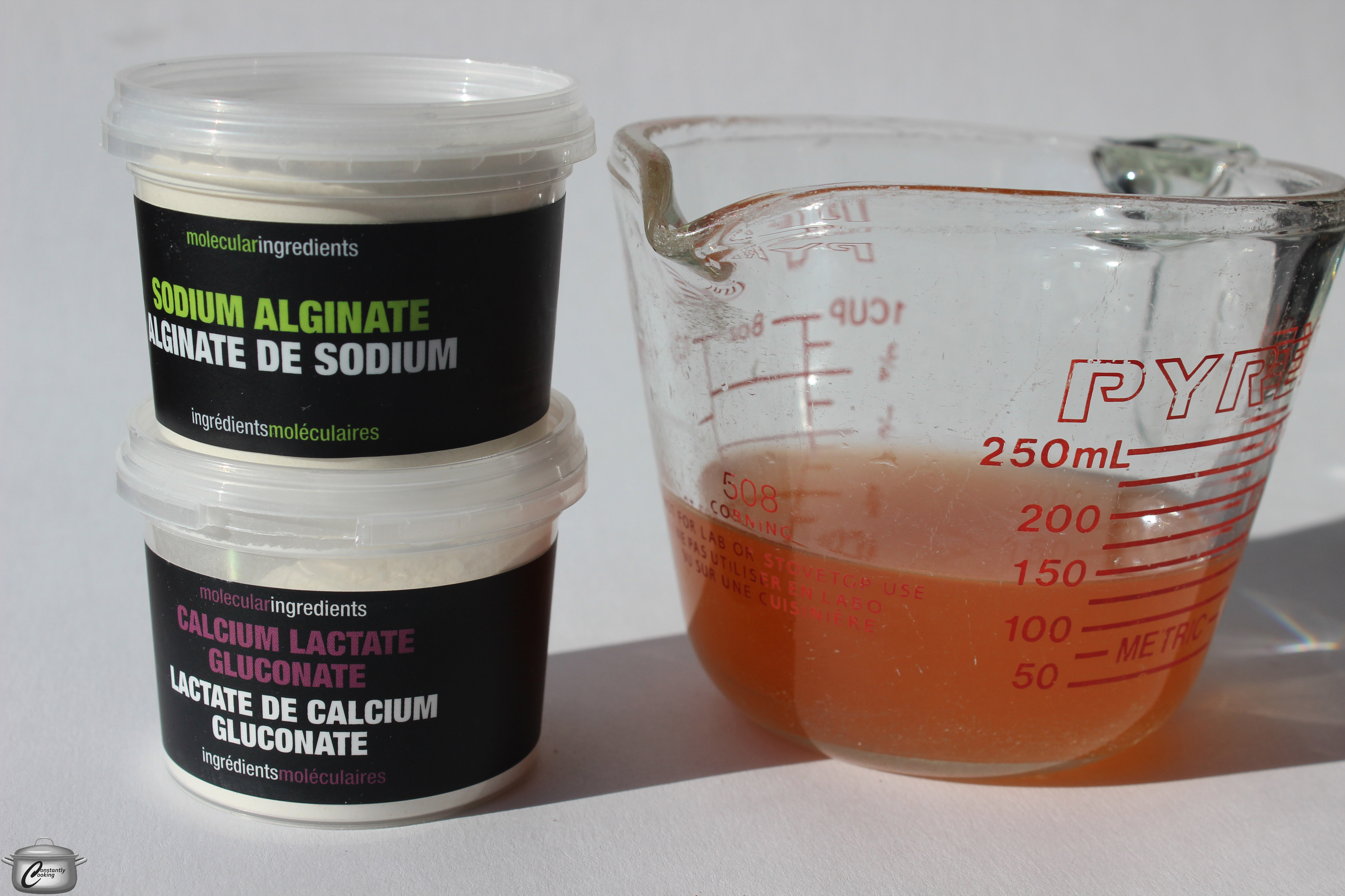 - Put the 1/2 cup (125 mL) of juice or coloured water in the smallest bowl and add 1/4 teaspoon (1.25 mL)of sodium alginate to the liquid. Use an immersion blender or very vigorous whisking to completely dissolve the sodium alginate. Set the mixture aside to allow air bubbles to dissipate.