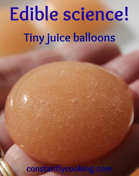 This is a fun project that kids really enjoy. The littlest ones can watch and then play with and eat the results, while older children and teens can probably do it all by themselves. While kids may not be familiar with molecular gastronomy, if you tell they they’re going to take a liquid (juice or water) and turn it into little balloons they can hold in their hand and then eat, you’re sure to capture their attention. The science behind this is called spherification and it is commonly used in many restaurants today because it’s one of the easiest tricks in the molecular gastronomy toolbox. I’ve enjoyed finding on my plate little pearls of beet juice, green tea, balsamic vinegar and more over the past few years. If you’re using water instead of juice, it might be fun to add a drop or two of food colouring so the experiment is more visually appealing. You can find the necessary food-grade chemicals, both of which are naturally derived, online or at molecular gastronomy supply shops. In Ottawa, contact Chef’s Paradise and in Toronto, Nella Cucina stocks the two products you’ll need and either would likely arrange for local contactless pickup or ship by mail order; Powder for Texture also ships nationally. Last comment: if you’re looking for other fun edible science experiments, check out this rock candy recipe and the instructions for making potato chips in the microwave.