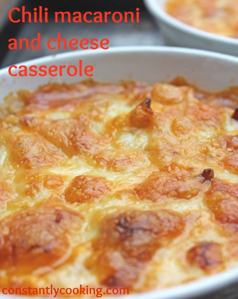 - Add the drained macaroni to the sauce, stirring to mix well. Pour half the noodle mixture into a greased 8 inch (20 cm) square casserole dish (or six 1.5 cup/375 mL oven-safe dishes), then spread the chili over top.