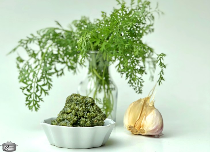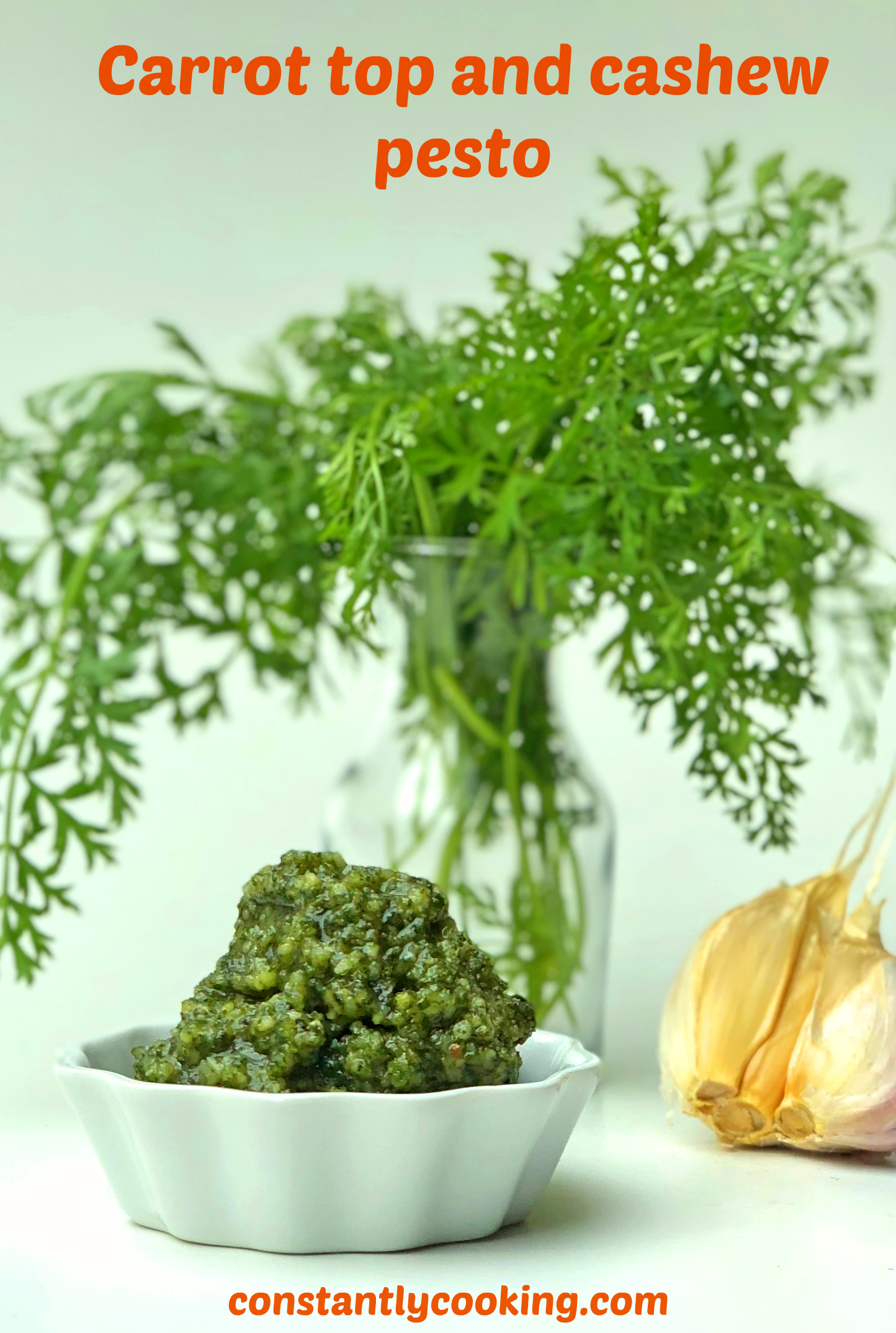 Did you know carrot tops contain 6 times more the vitamin C than the root part of the carrot and are a great source of potassium, calcium, vitamin A, dietary fibre and iron? I like to buy organic carrots so that I can use the tops as well as the crunchy orange roots. In addition to making scrumptious pesto, they’re great sauteed with a little oil, salt and pepper, or tossed into stir fries. I find the flavour of carrot tops to be a little bit peppery, reminiscent of arugula and they also taste faintly of the orange part of the carrot as well. I like to use this pesto to top grilled salmon or chicken and it’s a favourite when preparing appetizers such as pesto and goat cheese-topped crostini.