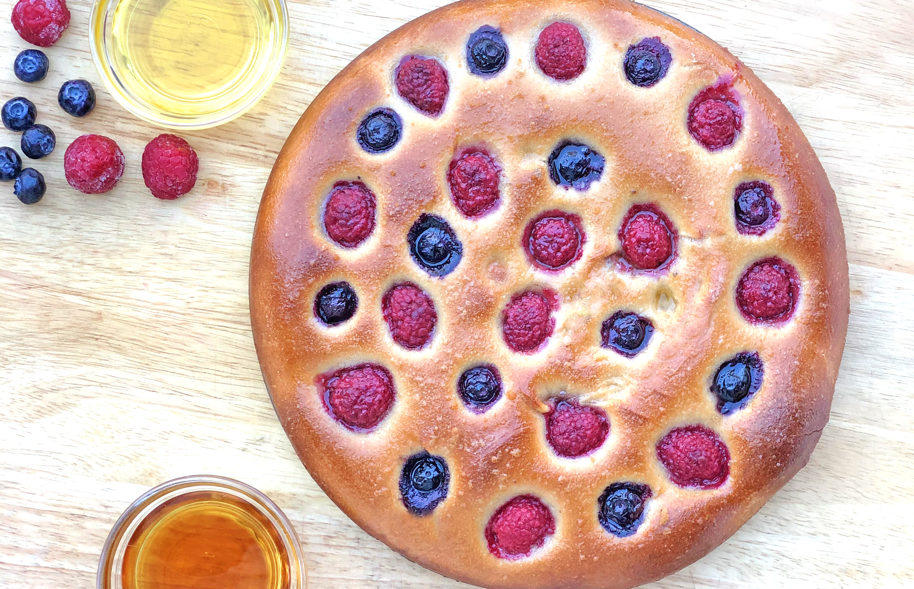 The internet has been flooded lately with gorgeous images of focaccia art, where cooks are carefully arranging herbs and vegetables on top of savoury focaccia dough then baking up their stunning creations. While I haven’t tried my hand at that craze (yet), the pictures I saw did inspire me to think about making a sweeter version of the classic savoury, salty Italian bread. My taste testers found this a most delicious experiment. This is the latest in my new Recipe of the Week series that I am creating for Ottawa At Home magazine, where I serve as food editor, and it’s a real winner.