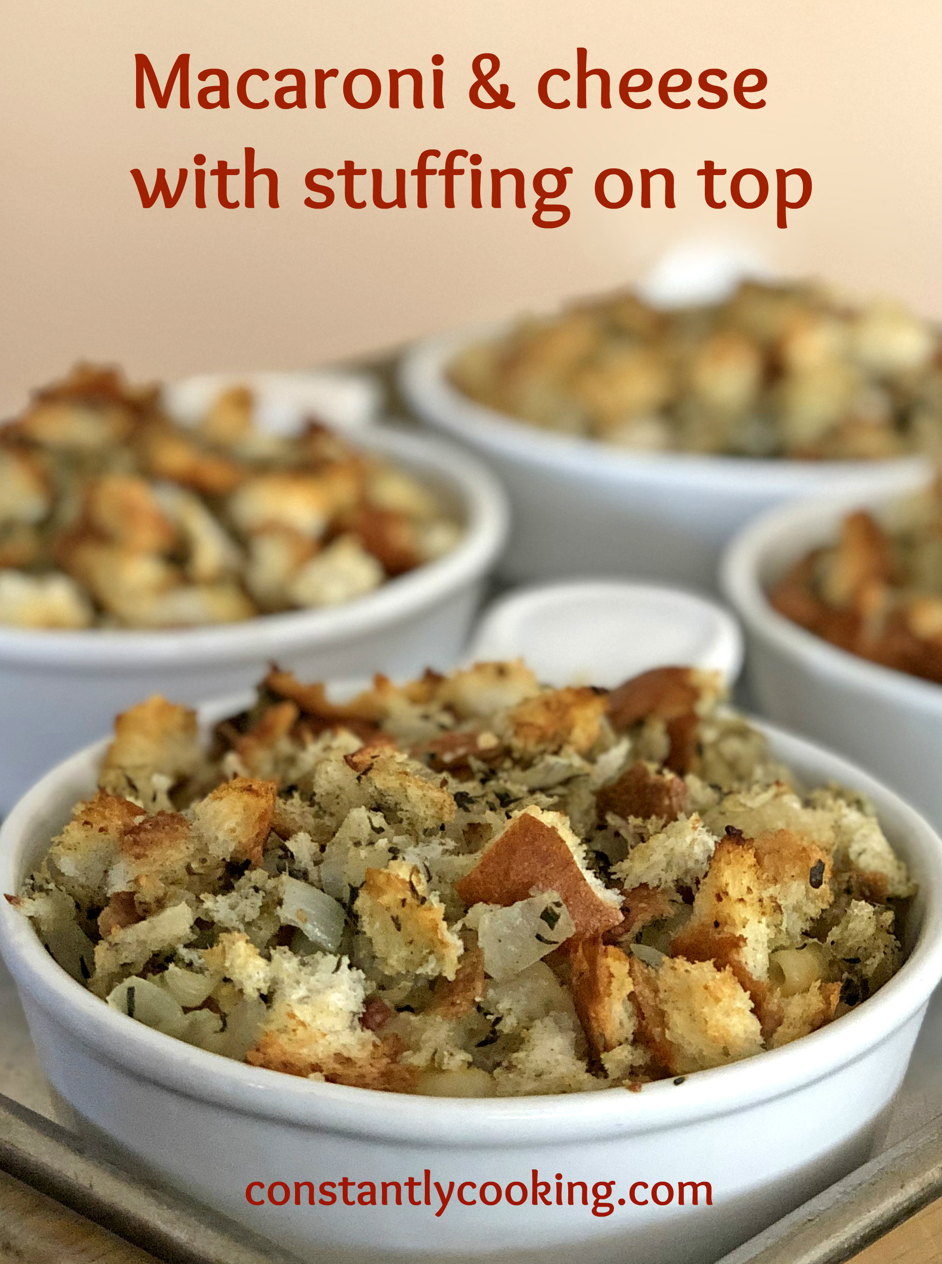 • Pour the mac and cheese mixture into a greased 8 inch (20 cm) square casserole dish (or four 2 cup/500 mL oven-safe dishes), then sprinkle the stuffing over top.