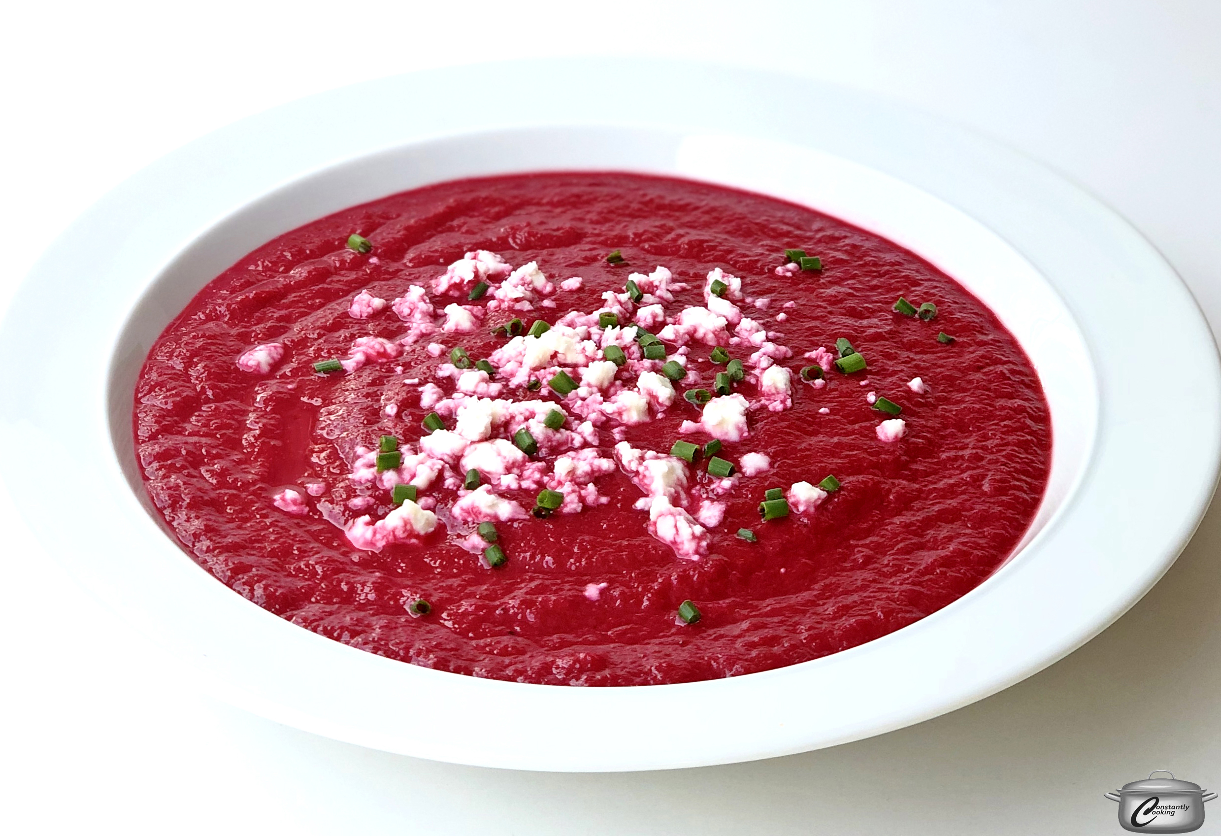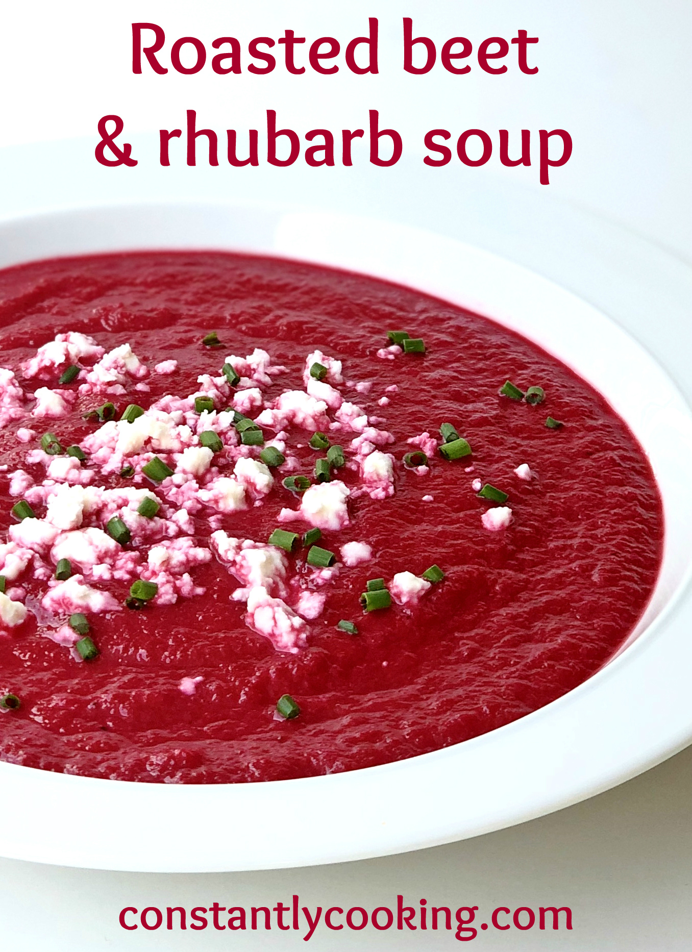 This simple to prepare soup is rich and flavourful and makes a great vegetarian or vegan meal. If using fresh rhubarb, be sure to cut off the leaves and stem ends and wash thoroughly before chopping. Note that frozen beets, available in most supermarkets, work really well in this recipe. When serving, don’t skip the creamy cheese topping as it really rounds out the flavour. Vibrantly coloured, this soup would also be fun served as shooters. If you like this recipe, you might also enjoy my roasted beet and rhubarb salad.