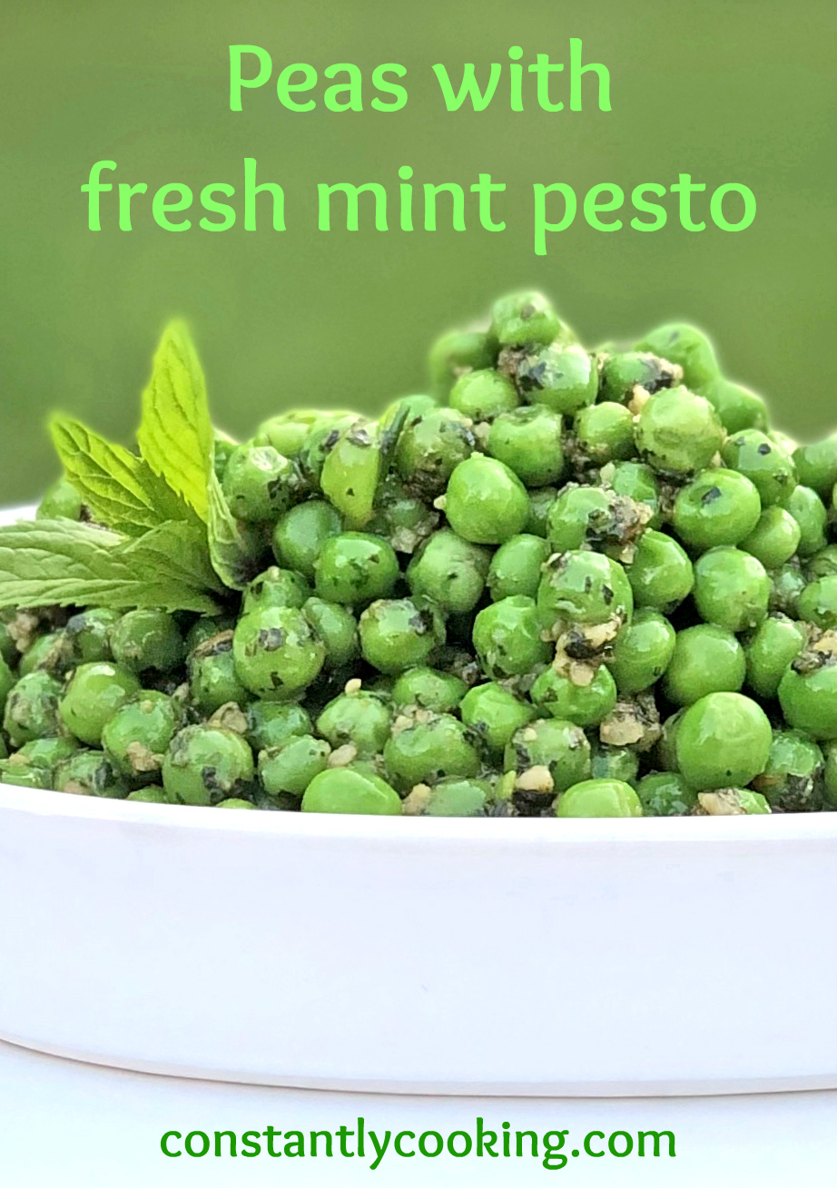 I’m a lifelong fan of peas and serve them to my family often. Fun story: when my daughter was about 2 years old, every time she saw peas on her plate she’d wave her tiny little hand at them and call out cheerfully, “Hi, little guys!” I have no idea where that came from but I am happy that to this day, peas are always welcomed at our table. I decided to up my game a little this week to take advantage of the out-of-control mint in my garden. This simple pesto is so delicious and I cannot wait to try it on chicken, fish, pasta, carrots, crostini and more.