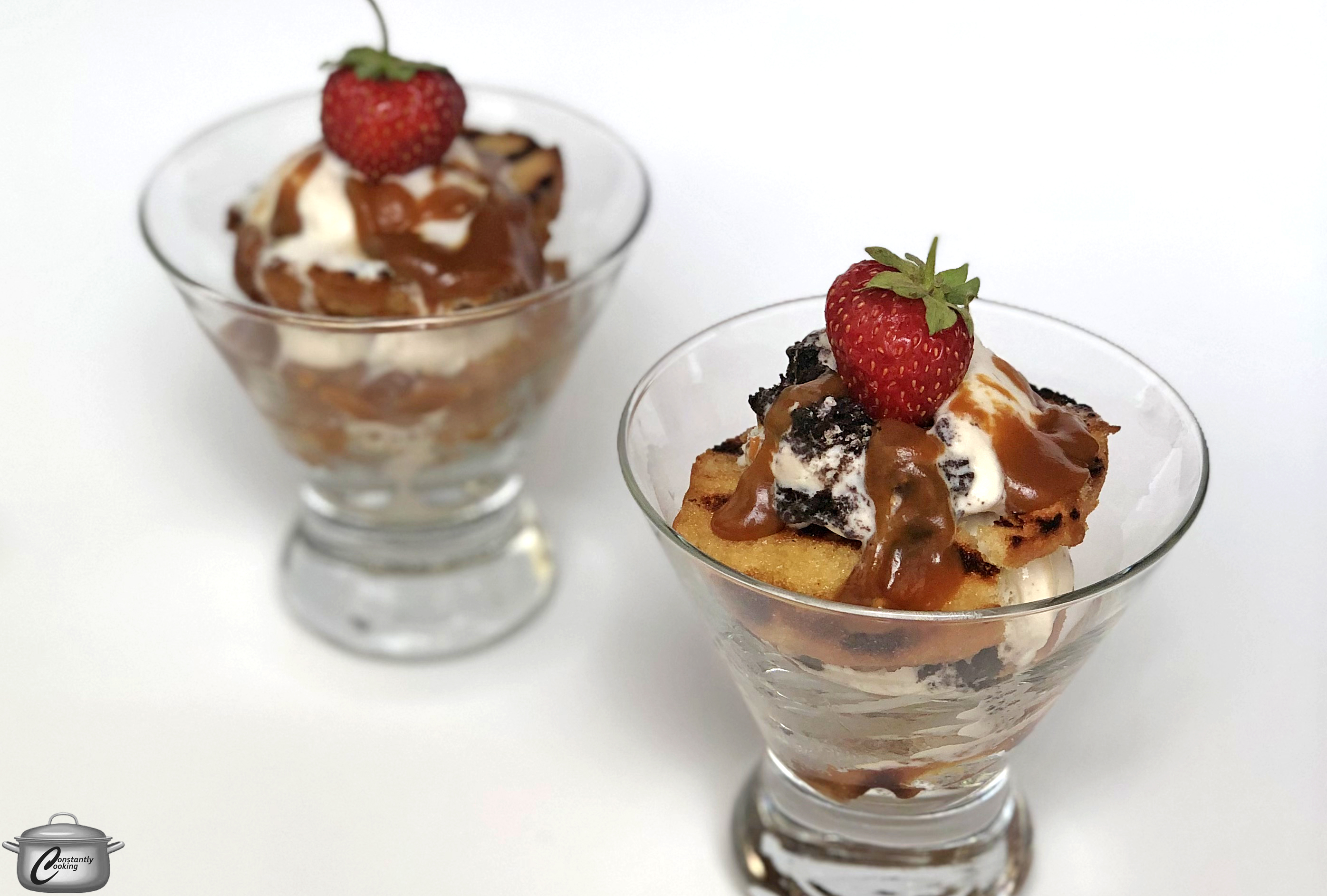 - Put a little ice cream in the bottom of 4 serving dishes. Add a donut layer, more ice cream, another half donut, a little more ice cream and drizzle sauce on top. Top with fresh fruit if desired. Serve immediately.